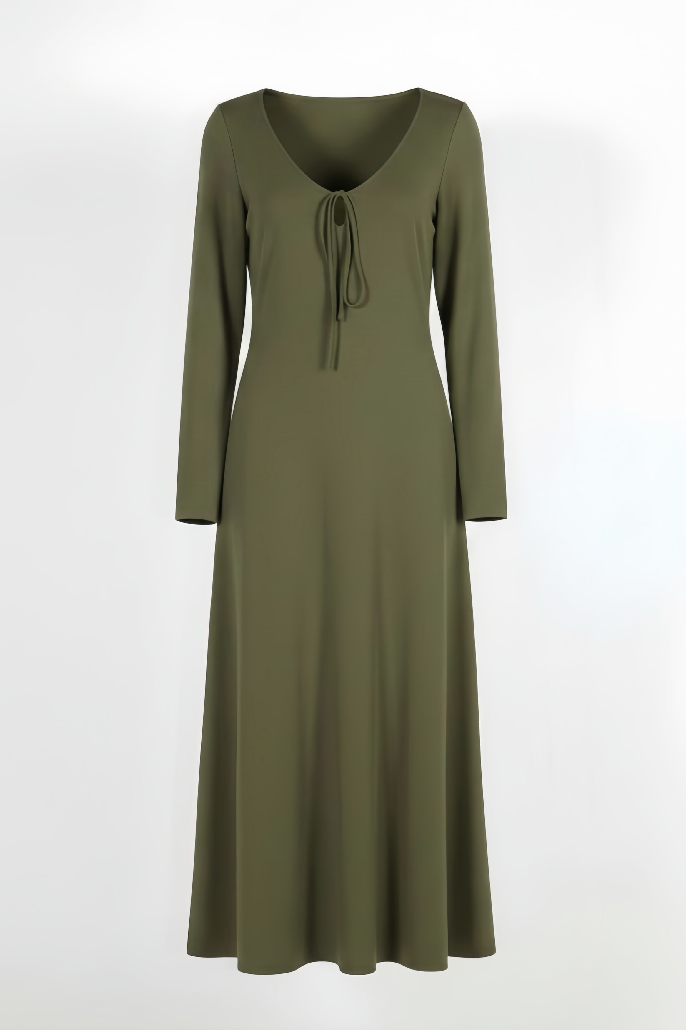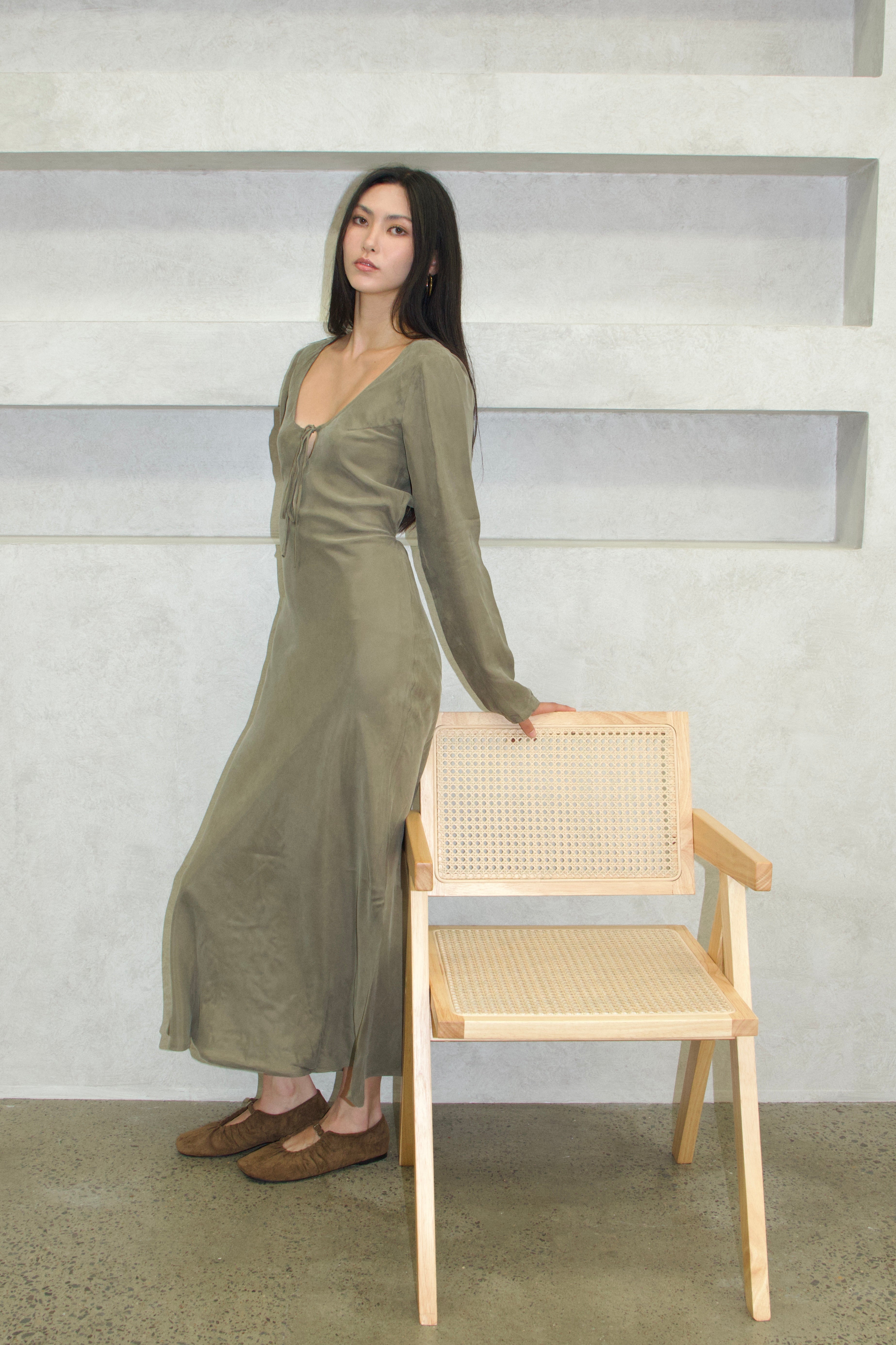 - Design Feature: Designed with a deep V neckline and adjustable tie-front, this dress allows for a custom, comfortable fit while softly shaping the waist without feeling restrictive. The long sleeves balance the open neckline, creating an easy, wearable silhouette that feels considered yet effortless. Cut in a fluid, elongated midi shape, it drapes naturally over the body and moves with you.