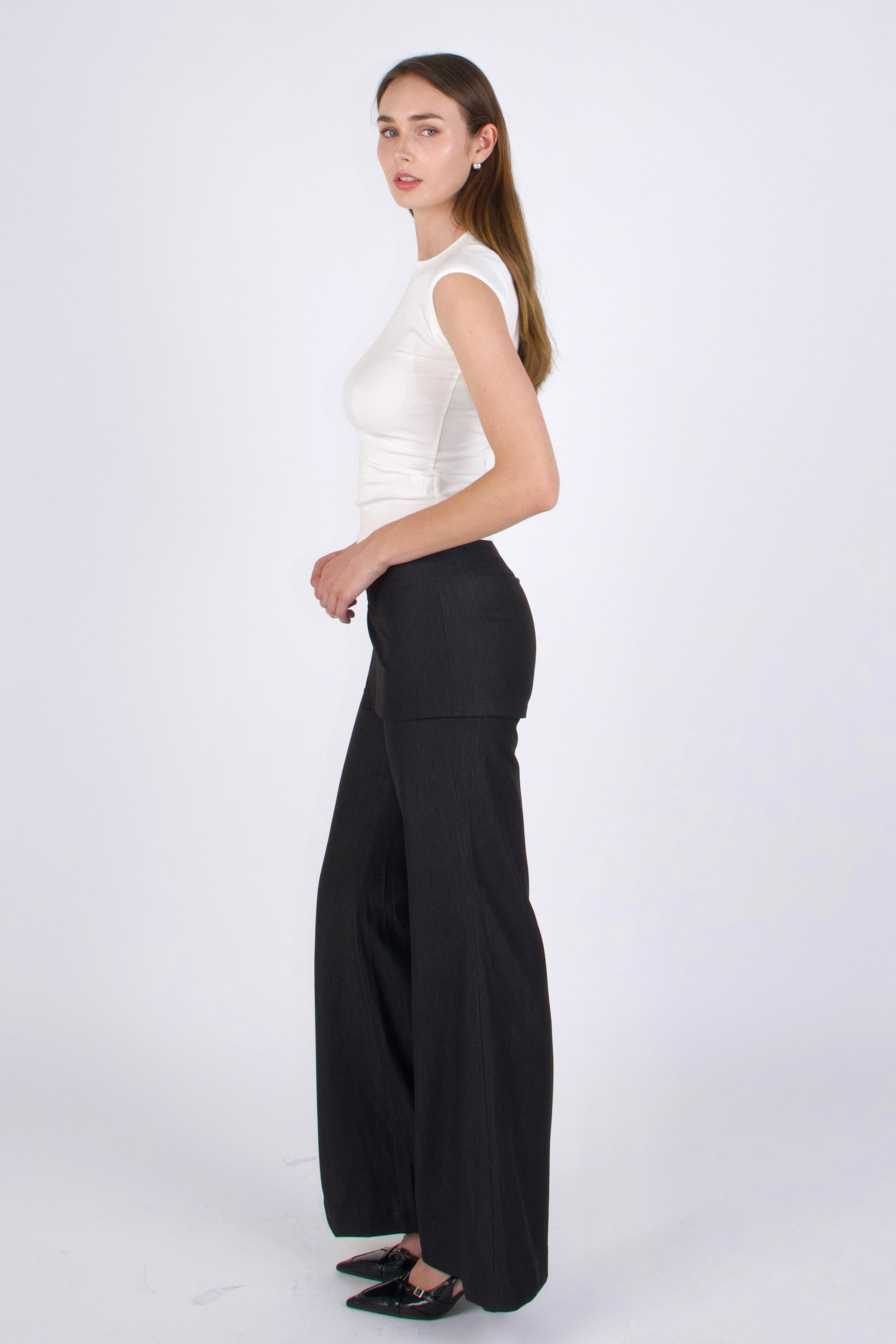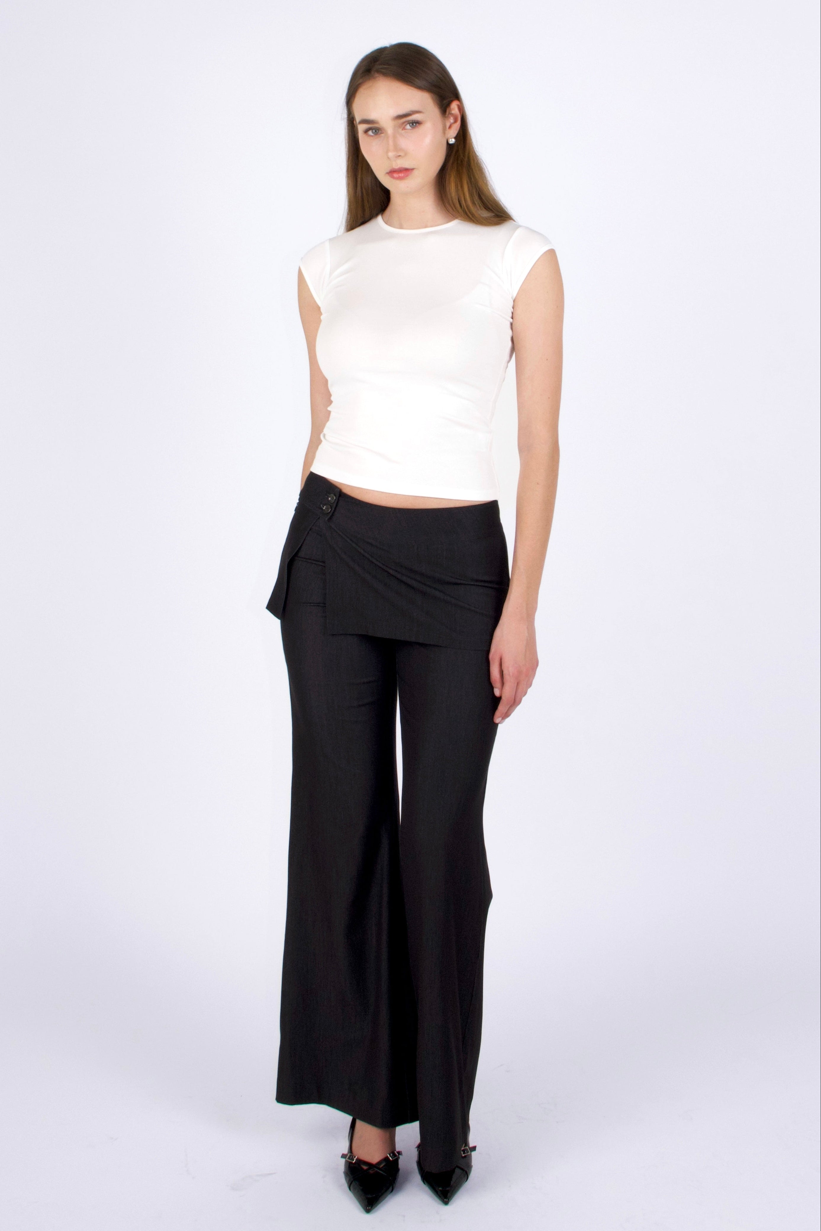The Tierra Pants reinterpret tailoring through balance and texture. Designed with a low-rise waist and a softly draped skirt overlay, they blur the line between structure and movement. The layered panel folds gently across the body, creating a quiet play of form, architectural yet fluid.