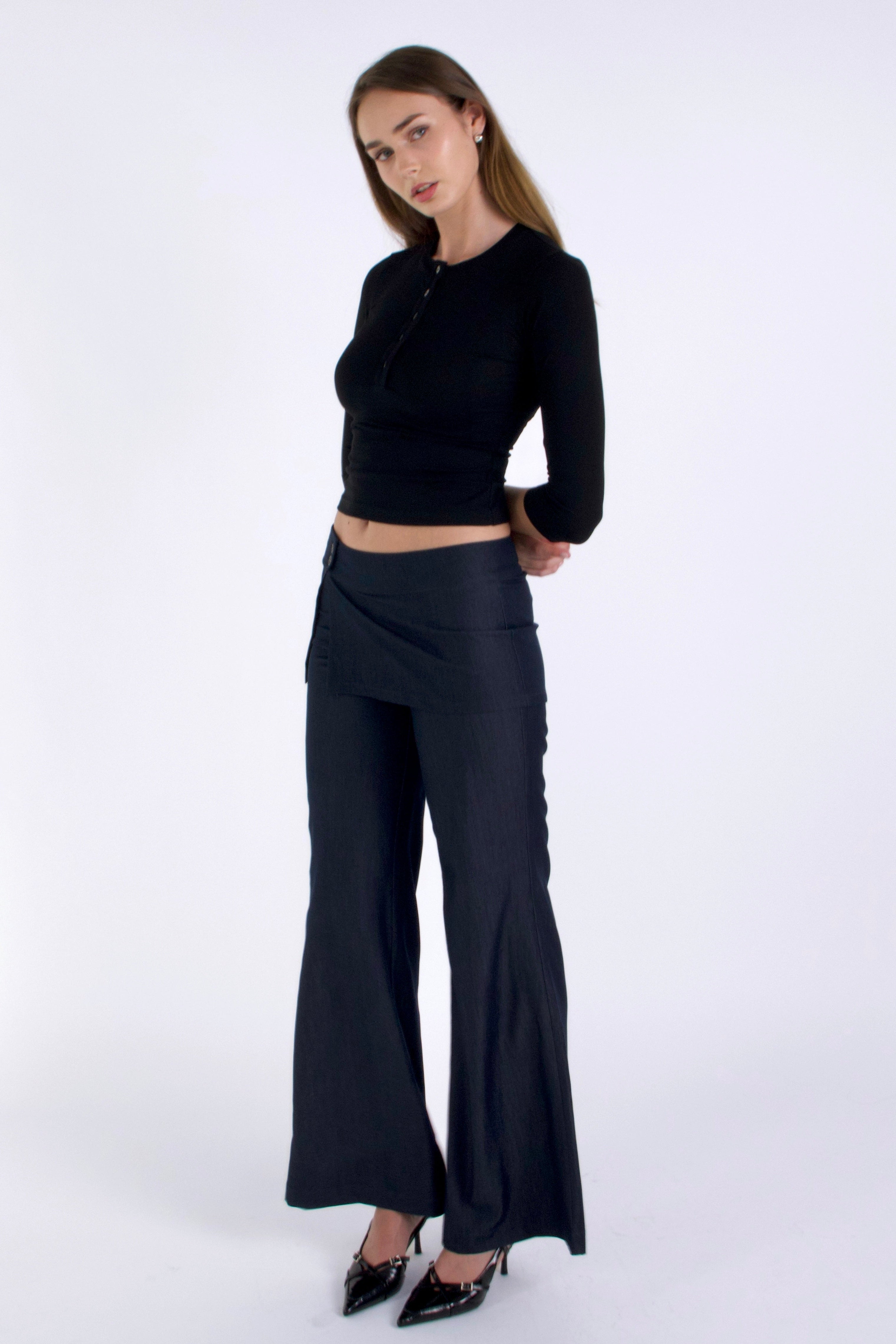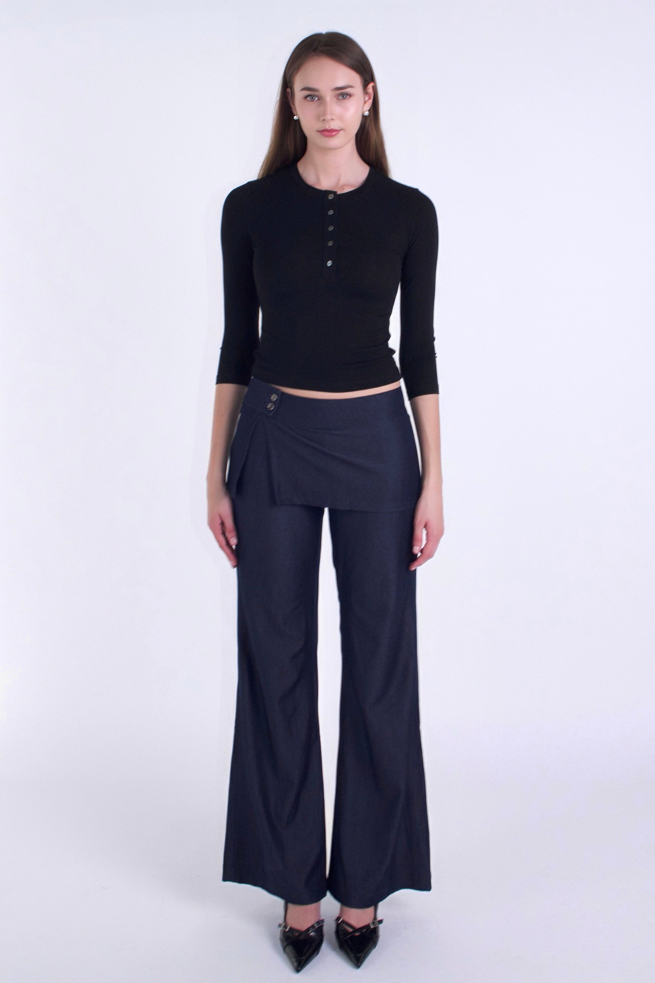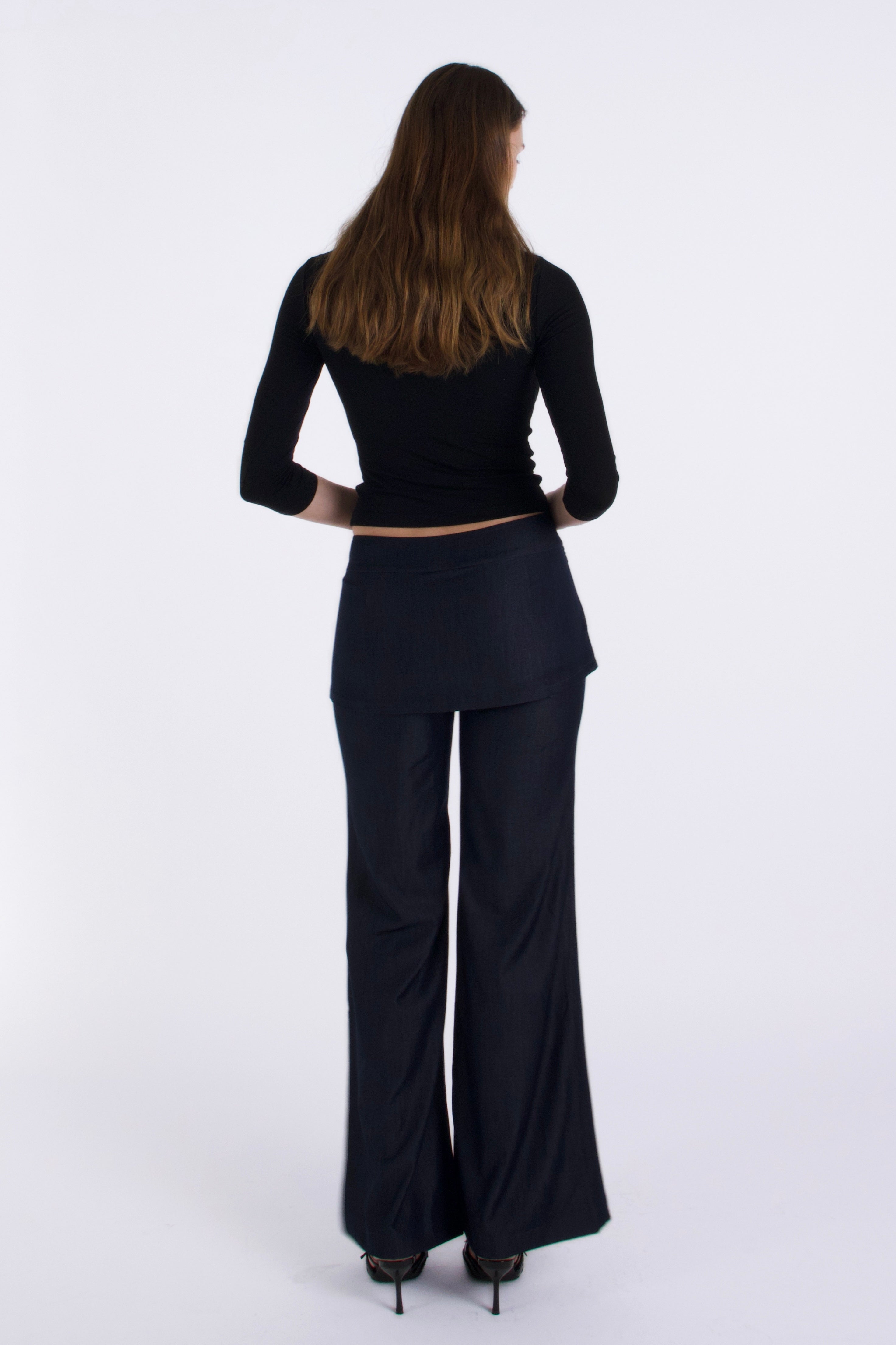The Tierra Pants reinterpret tailoring through balance and texture. Designed with a low-rise waist and a softly draped skirt overlay, they blur the line between structure and movement. The layered panel folds gently across the body, creating a quiet play of form, architectural yet fluid.