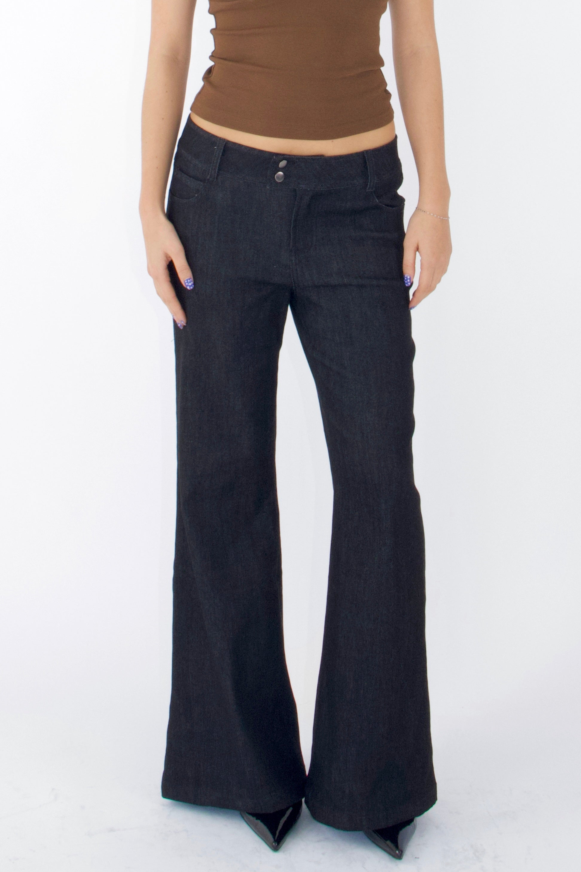 Low-rise, wide-leg stretch denim jeans inspired by early 2000s style. Minimal detailing and a double-button waistband add a subtle retro vibe. Stylish and versatile for any occasion
