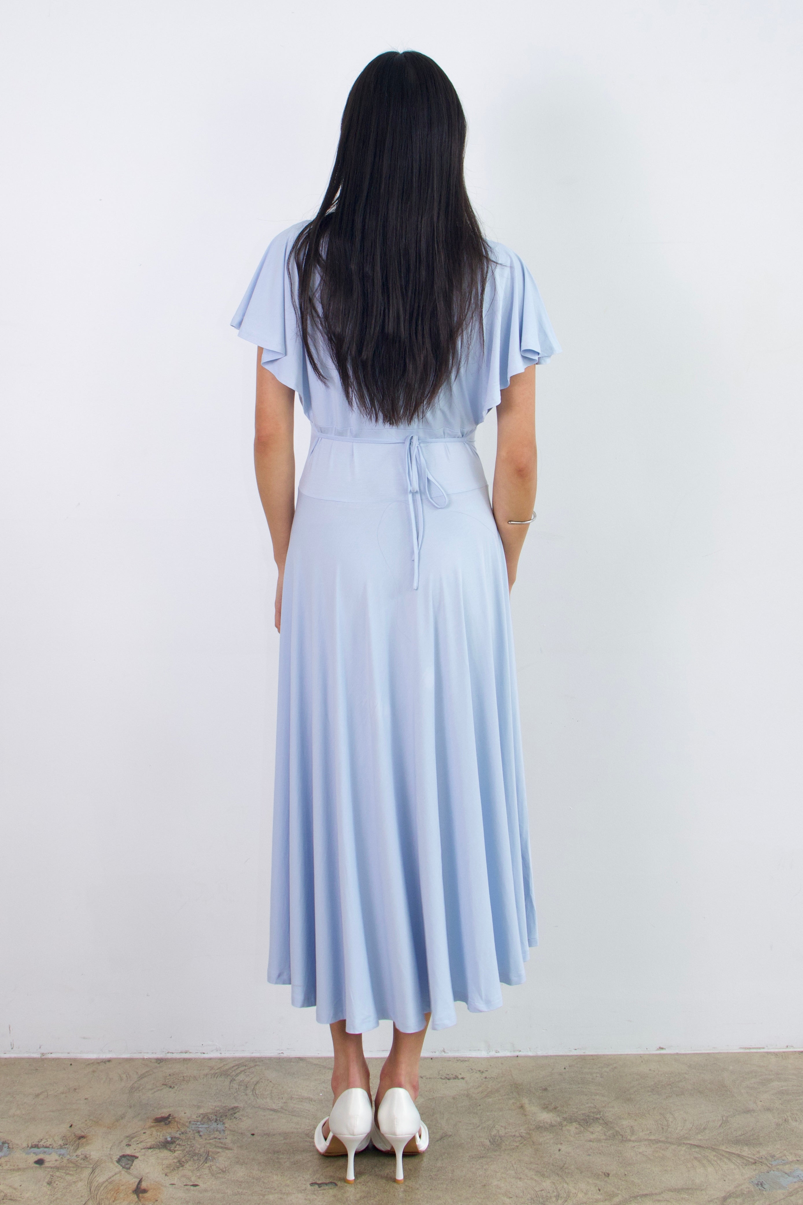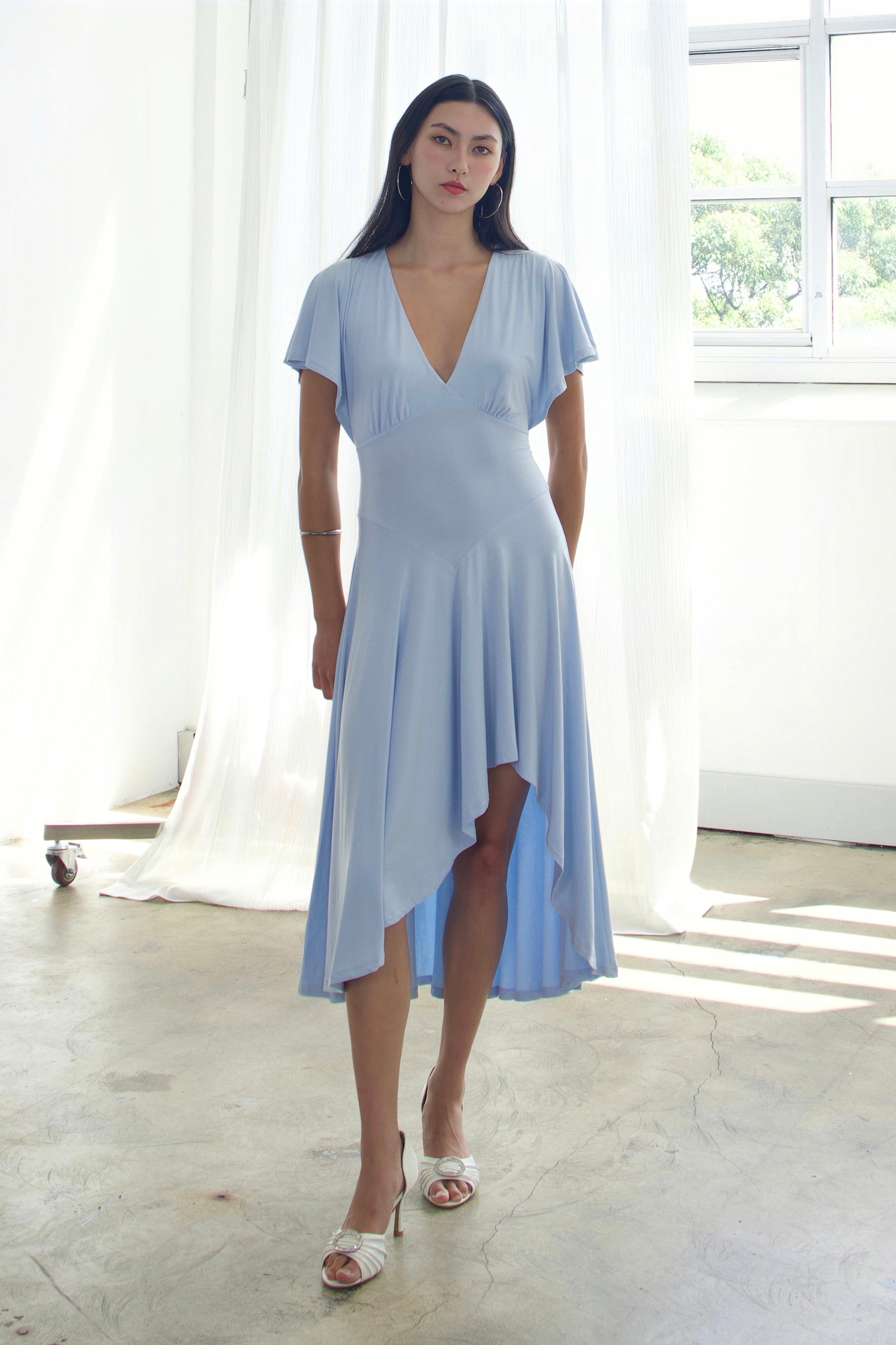 A softly draped silhouette with a deep V neckline, flutter sleeves, and a fluid asymmetric hem. Crafted to skim the body with ease, it flows gently as you walk — light, feminine, and quietly elegant.