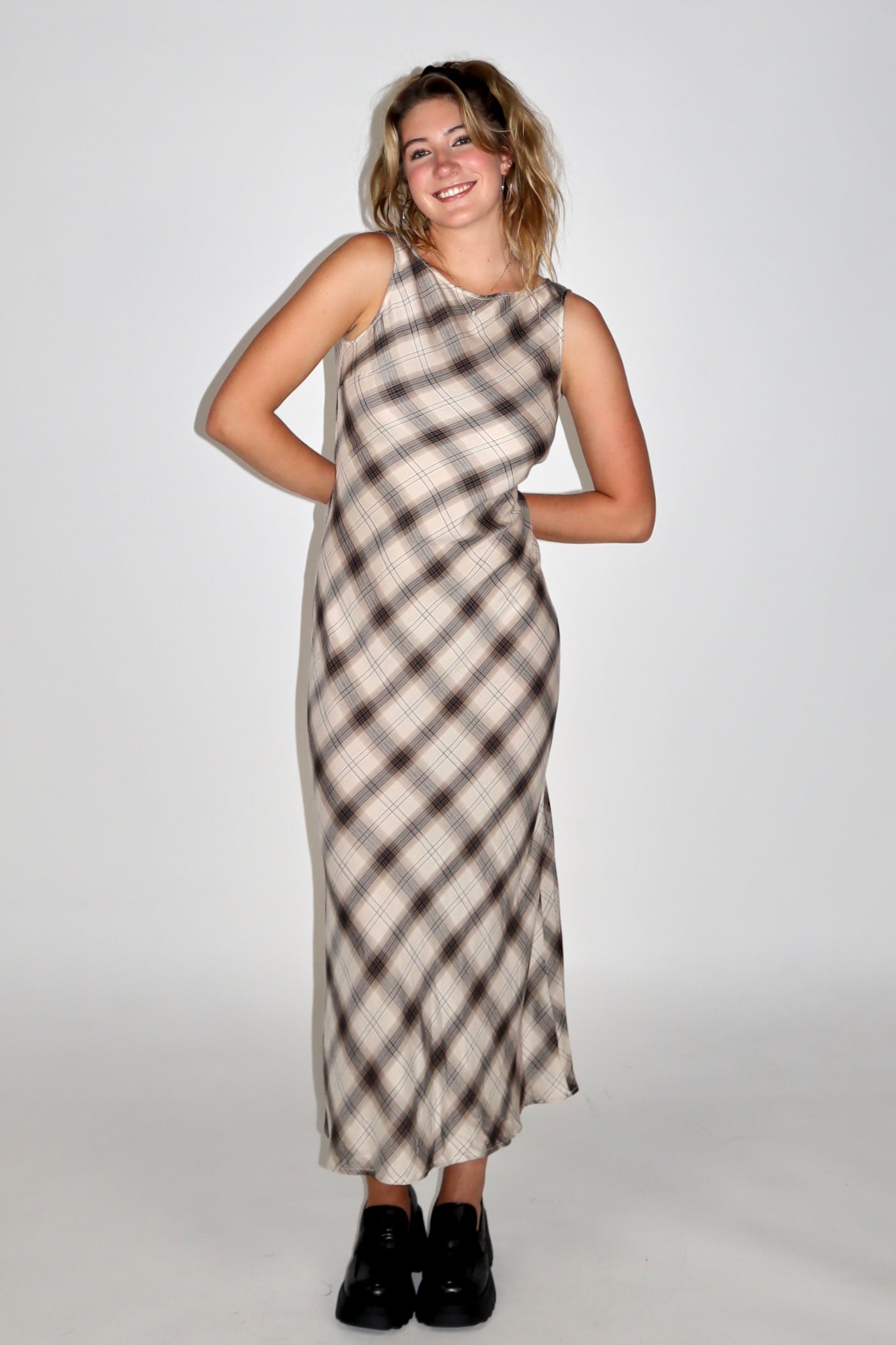 This sleeveless maxi dress channels understated 90s elegance with its boat neckline and fluid silhouette. Effortlessly refined, it's the kind of piece that needs no occasion—just your presence.