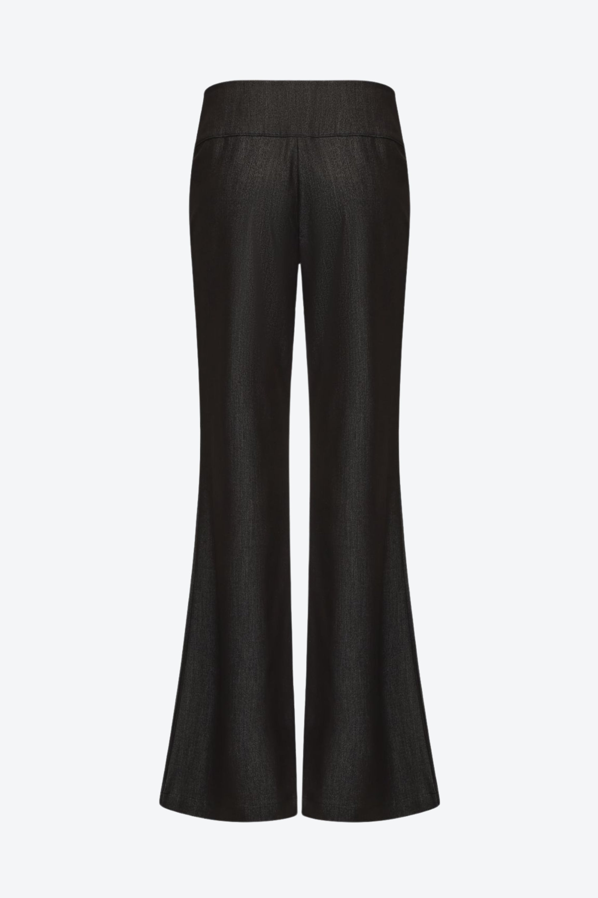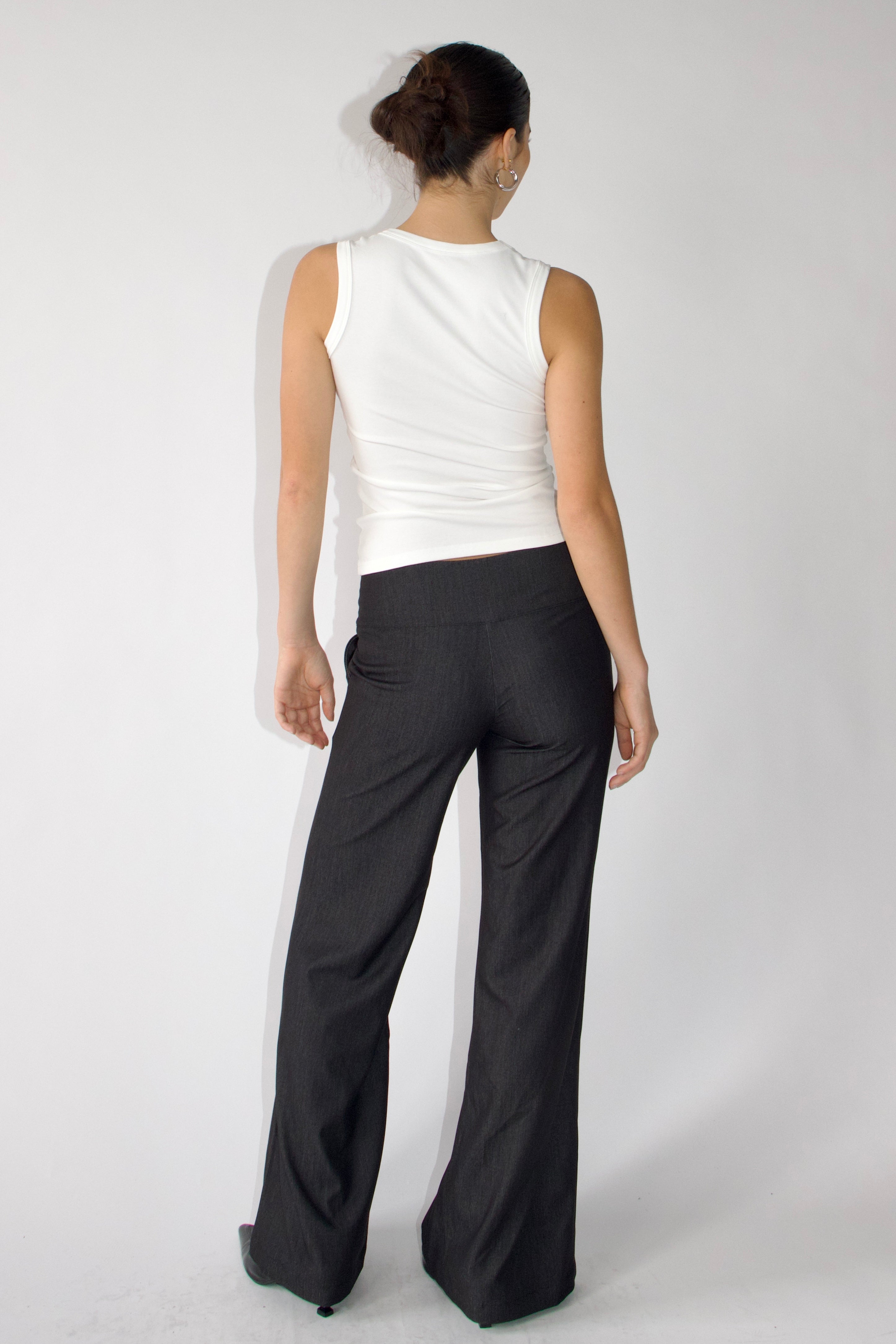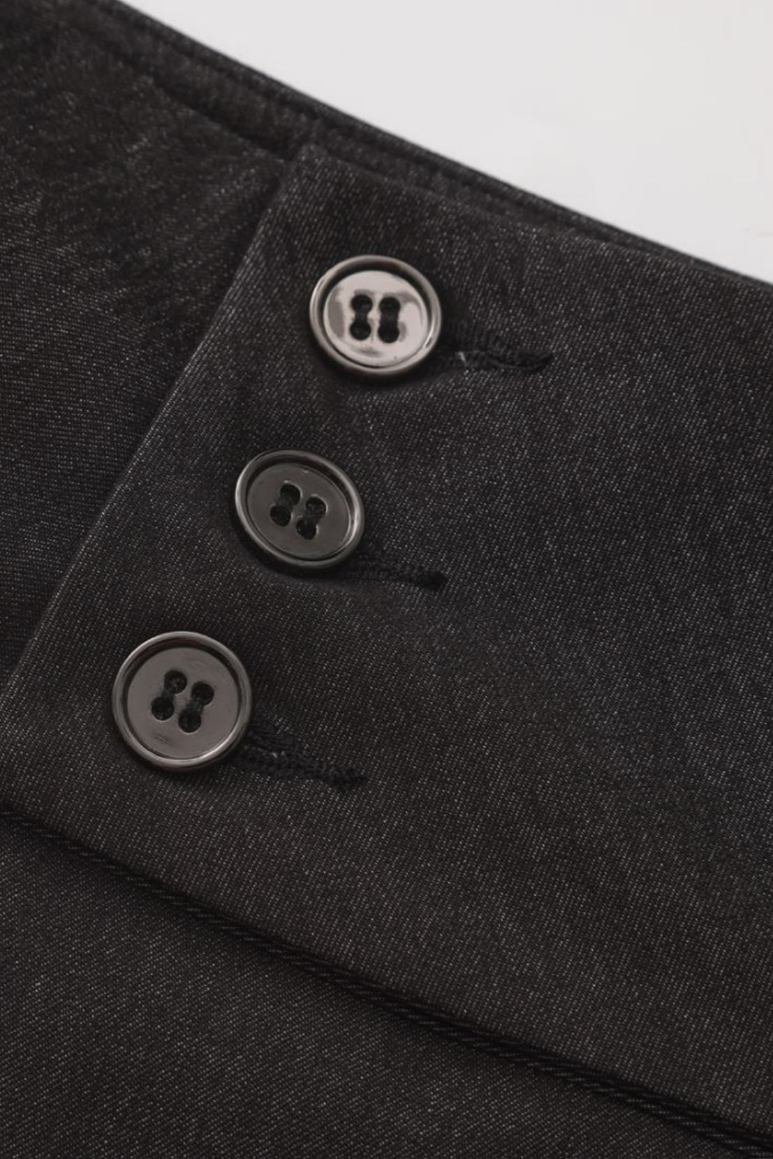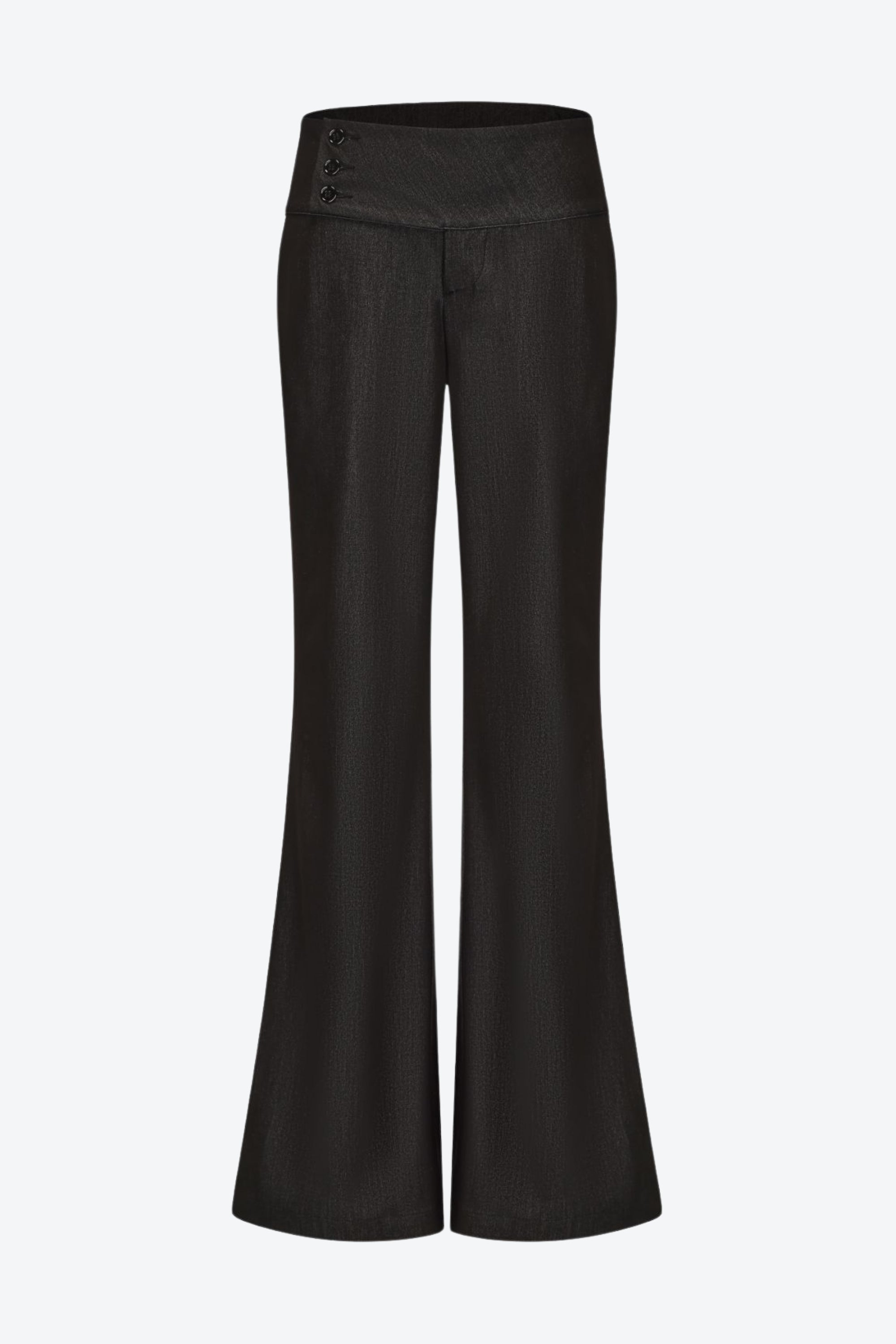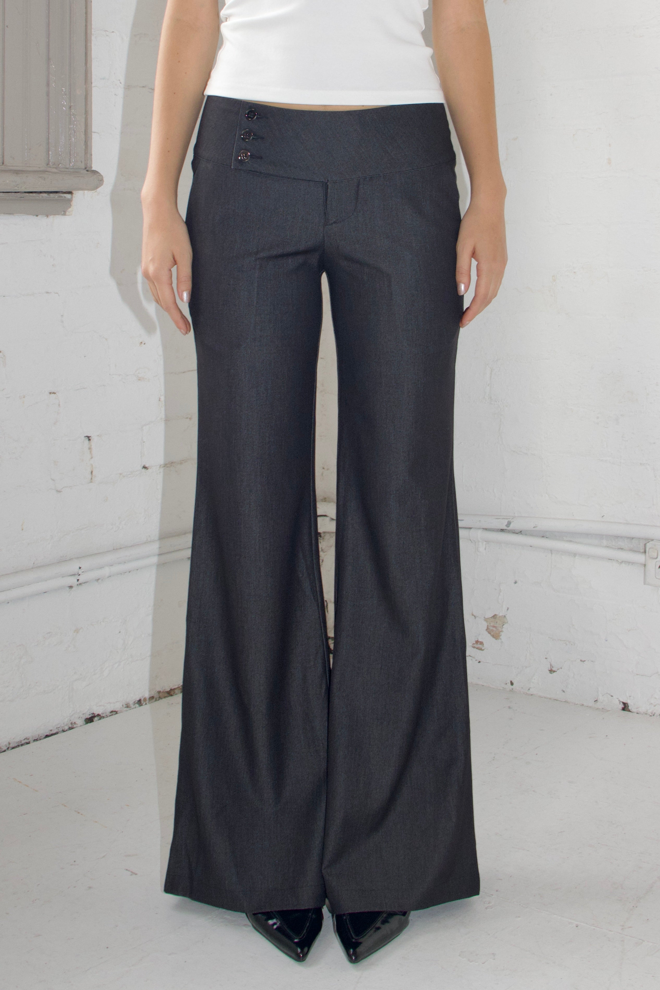 Early 2000s-inspired low-rise, wide-leg trousers feature a stylish waistband and buttons - blending comfort with chic style.