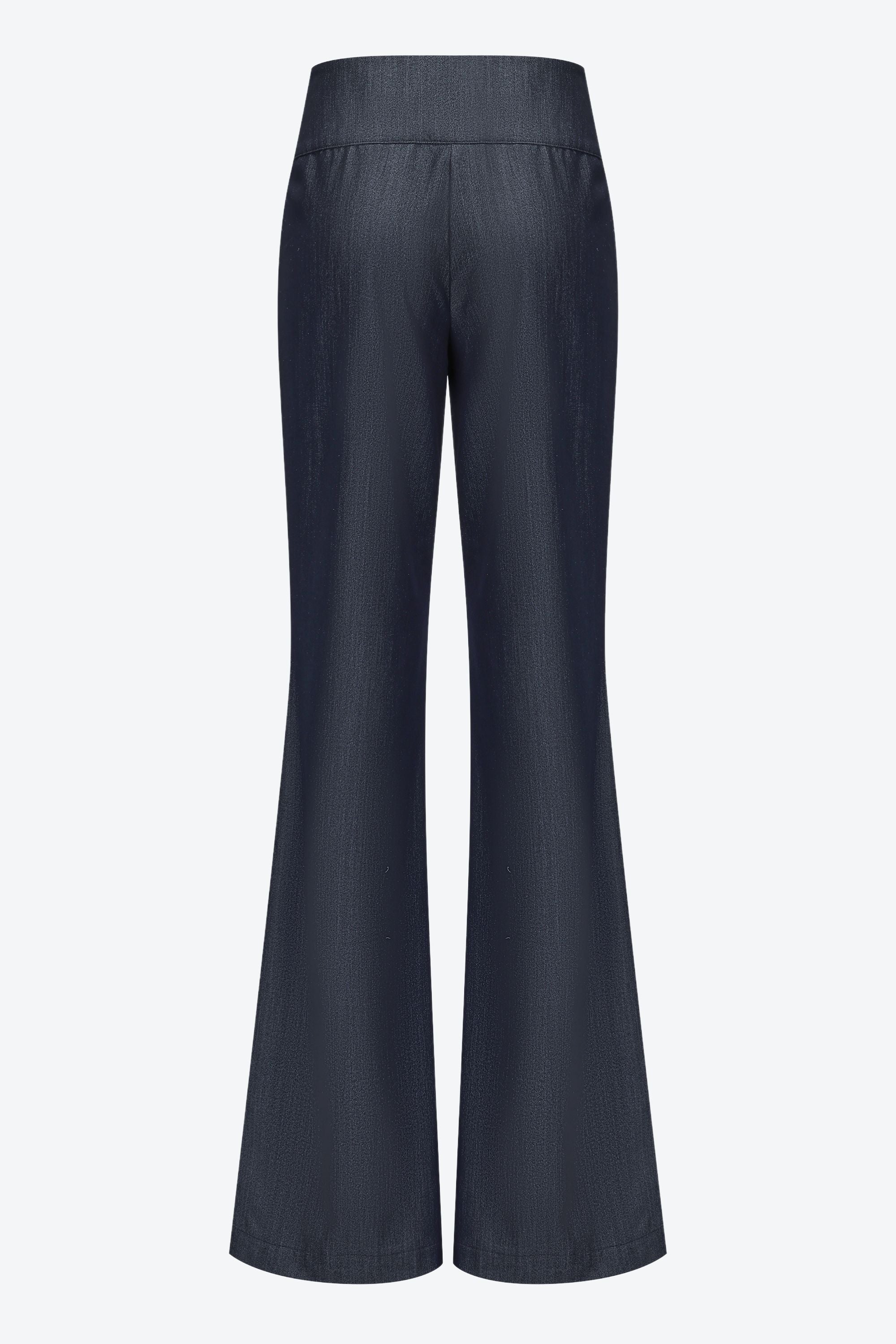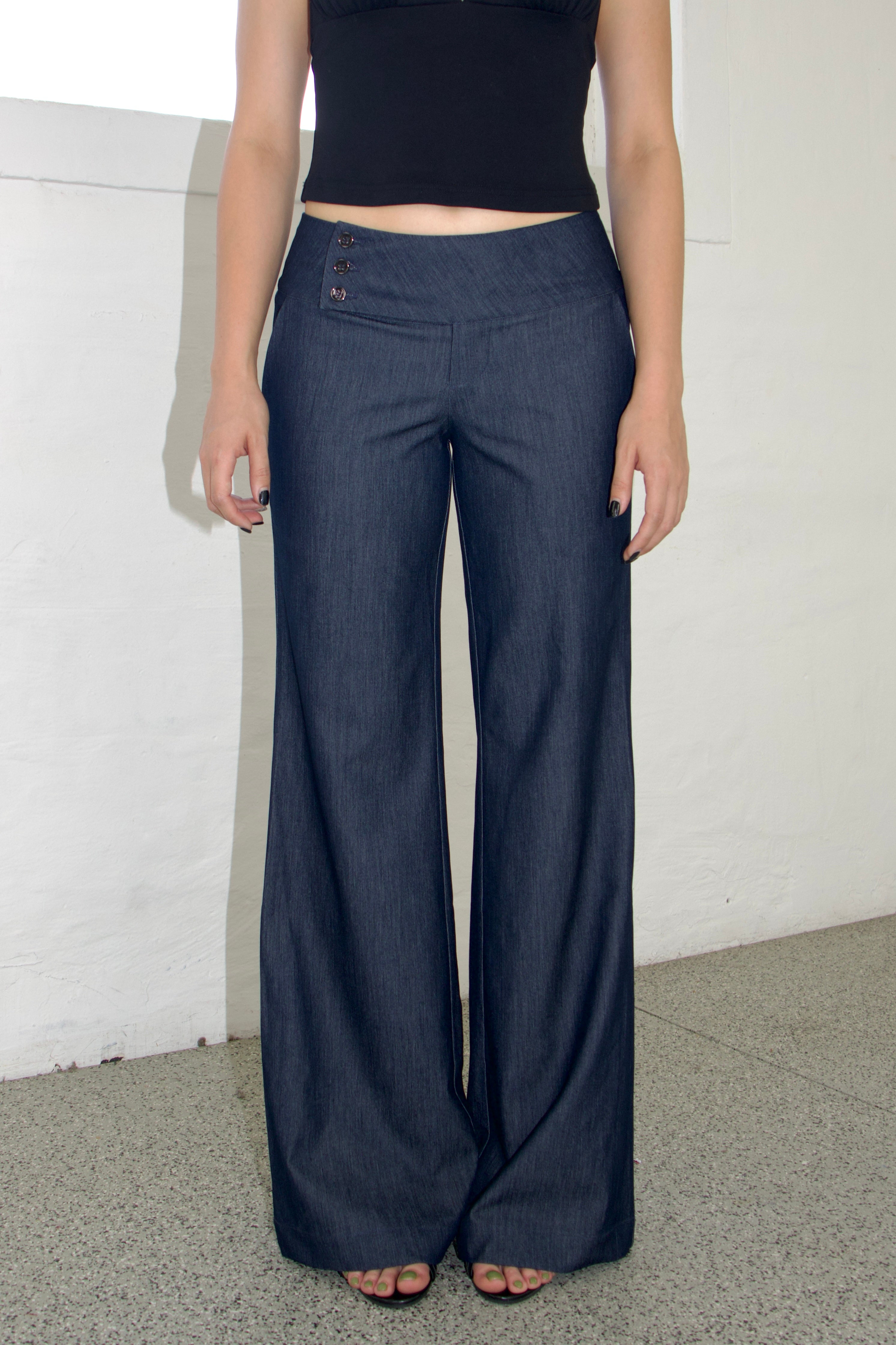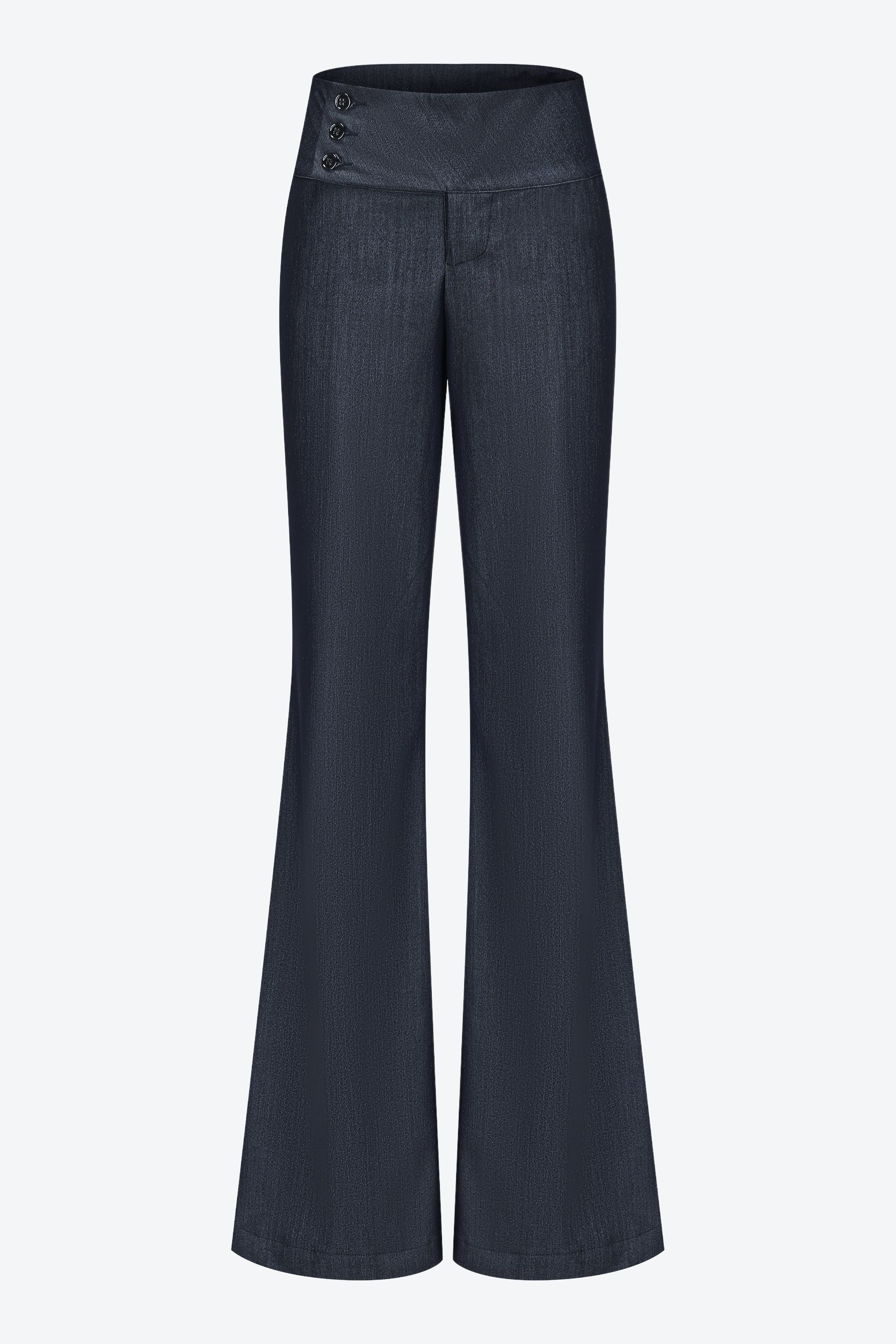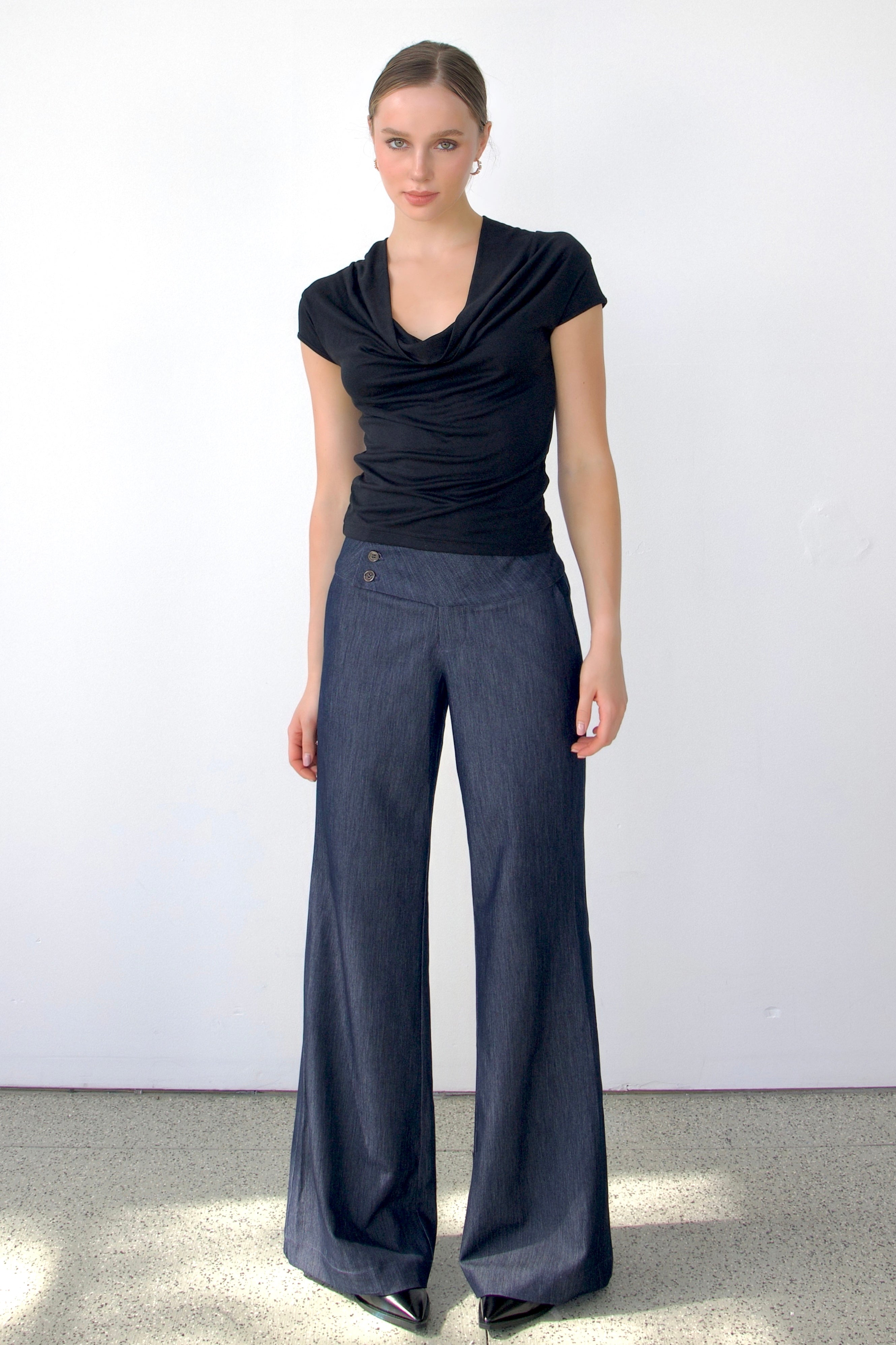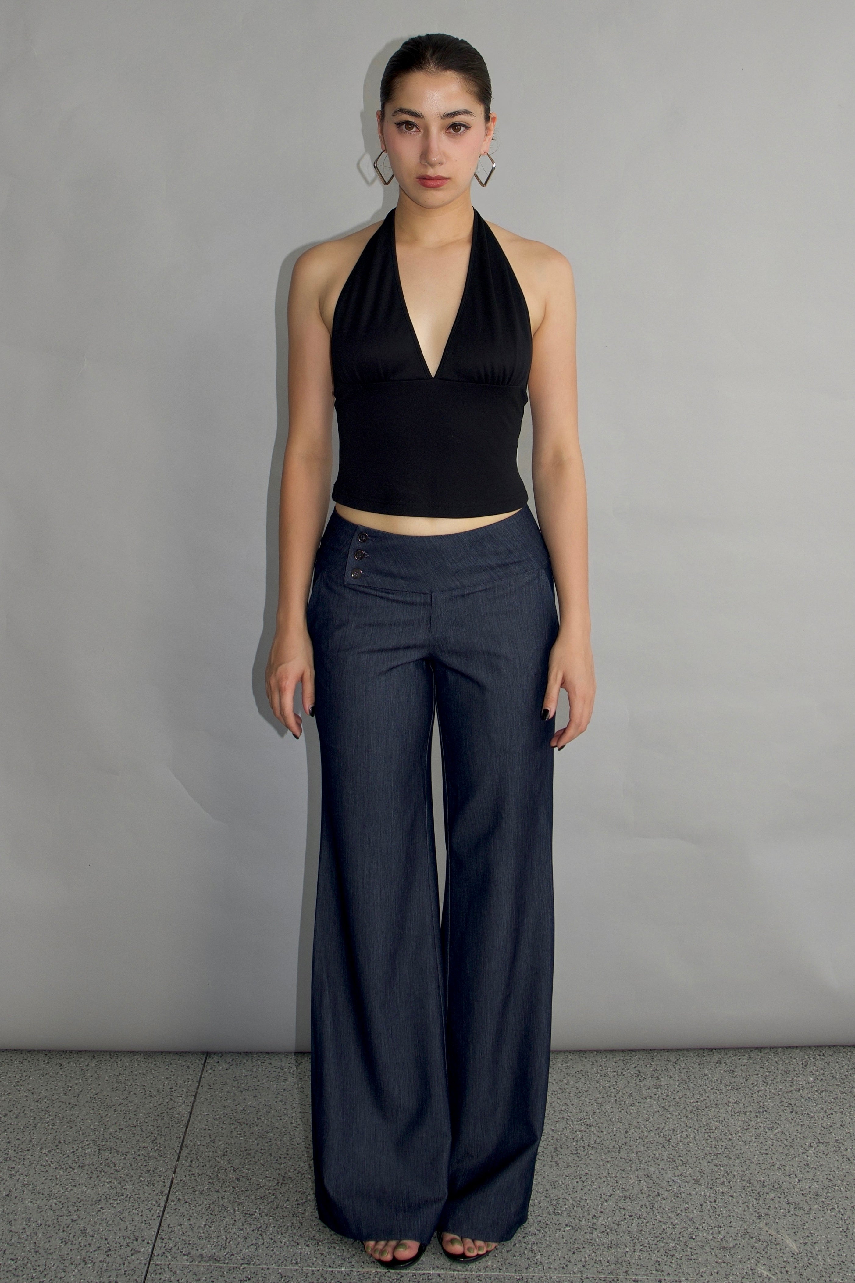 Early 2000s-inspired low-rise, wide-leg trousers feature a stylish waistband and buttons - blending comfort with chic style.