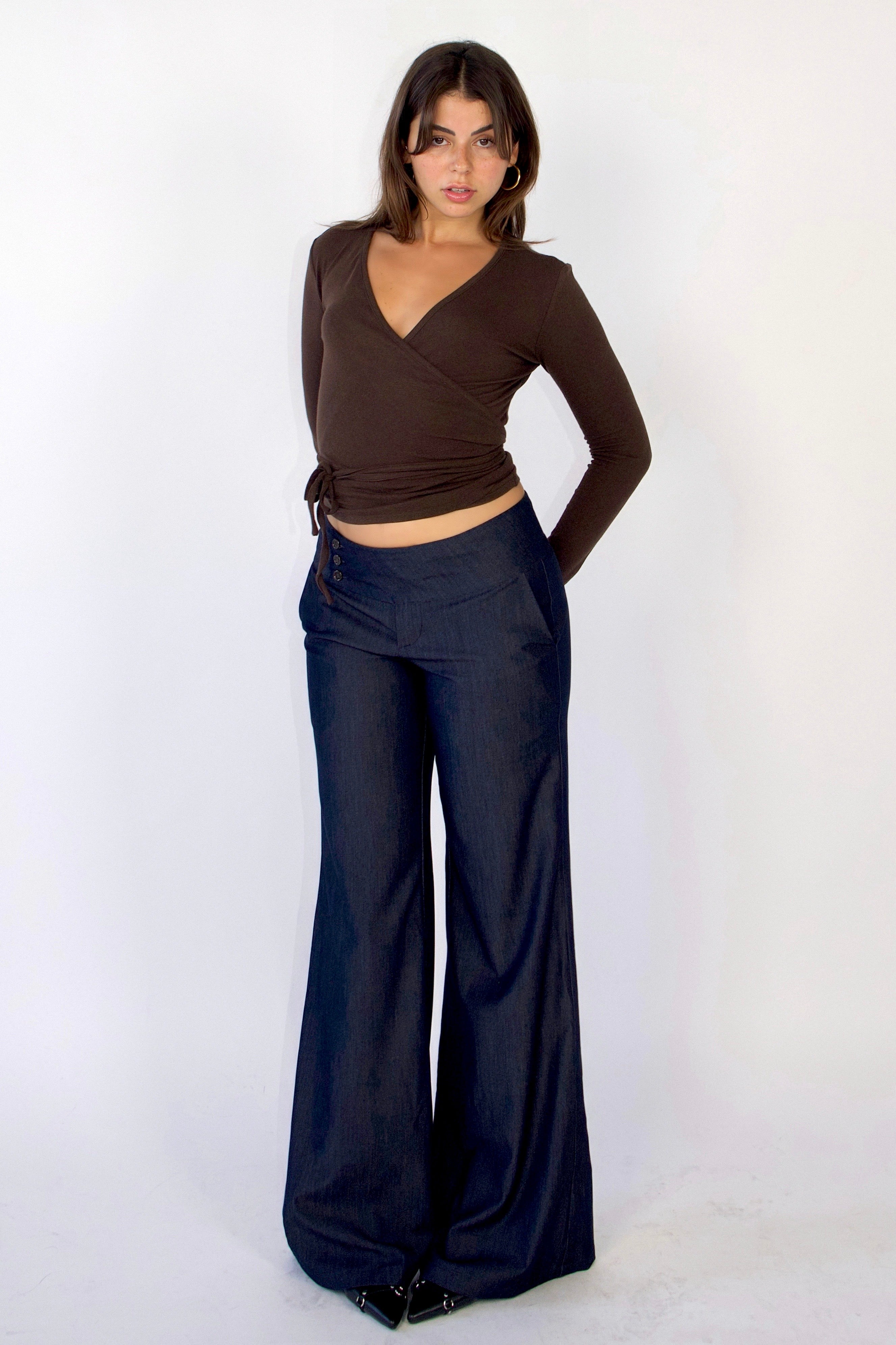 Early 2000s-inspired low-rise, wide-leg trousers feature a stylish waistband and buttons - blending comfort with chic style.