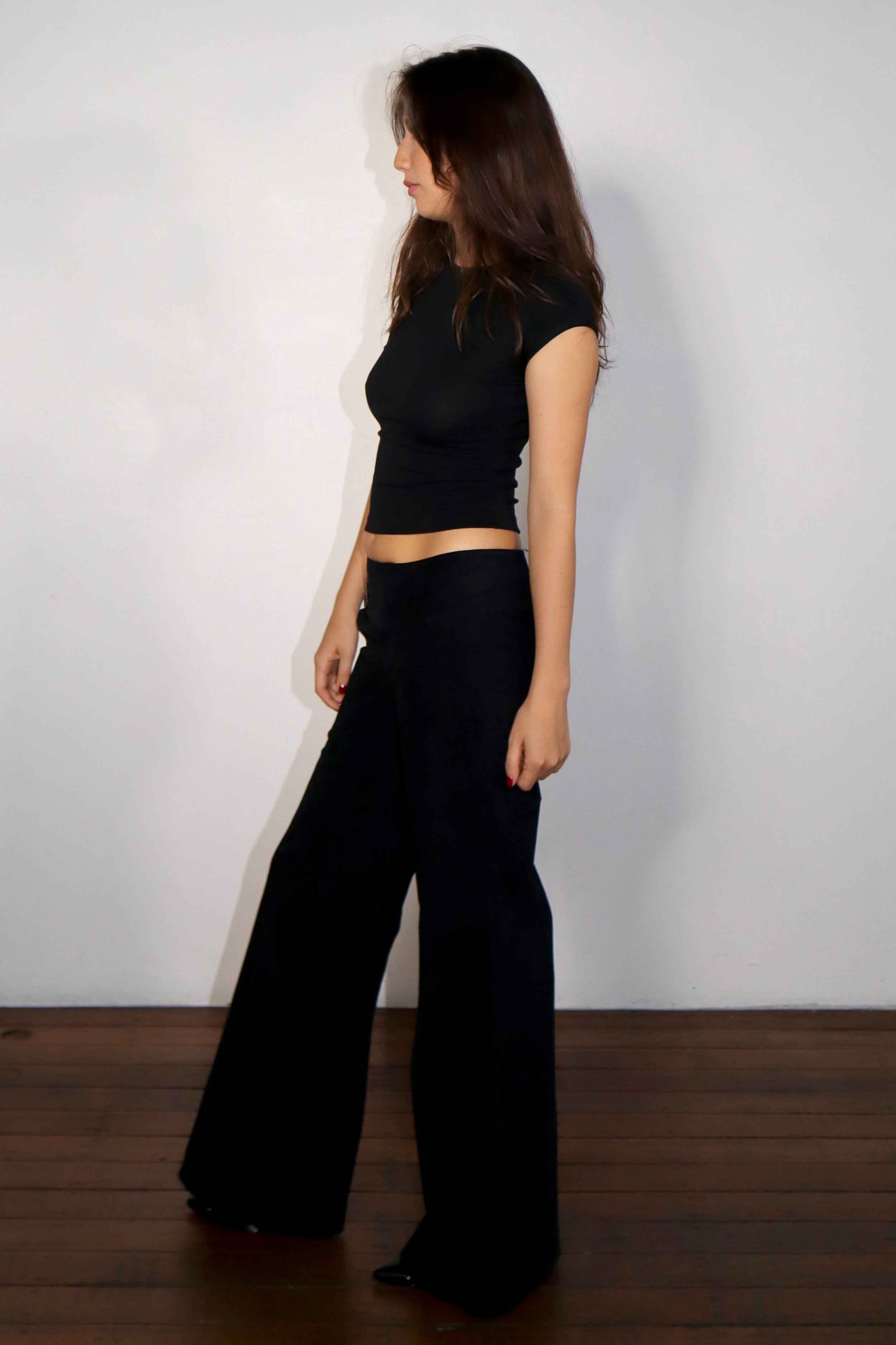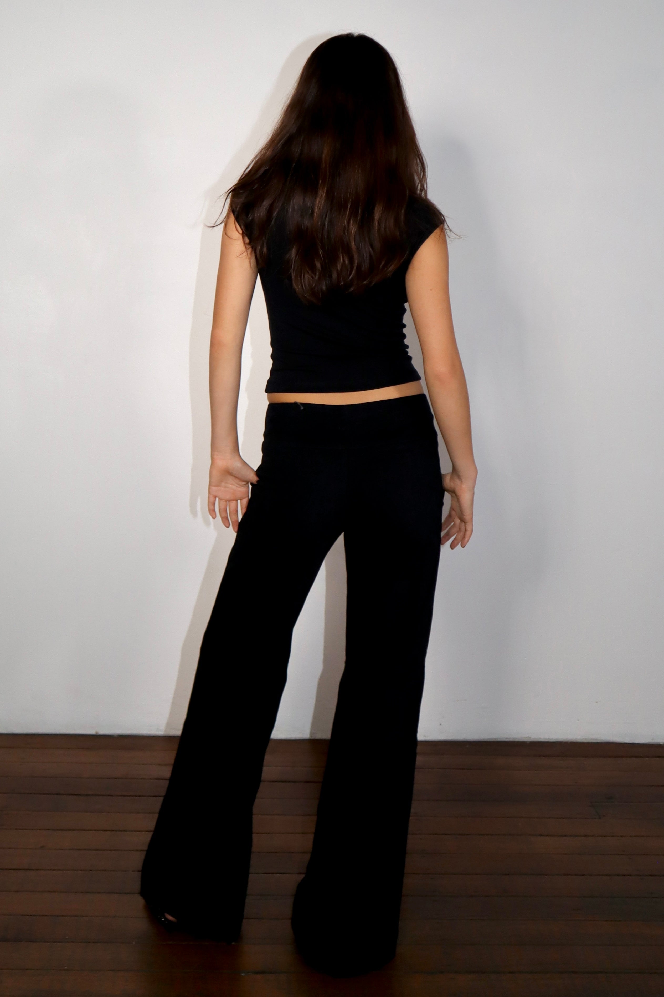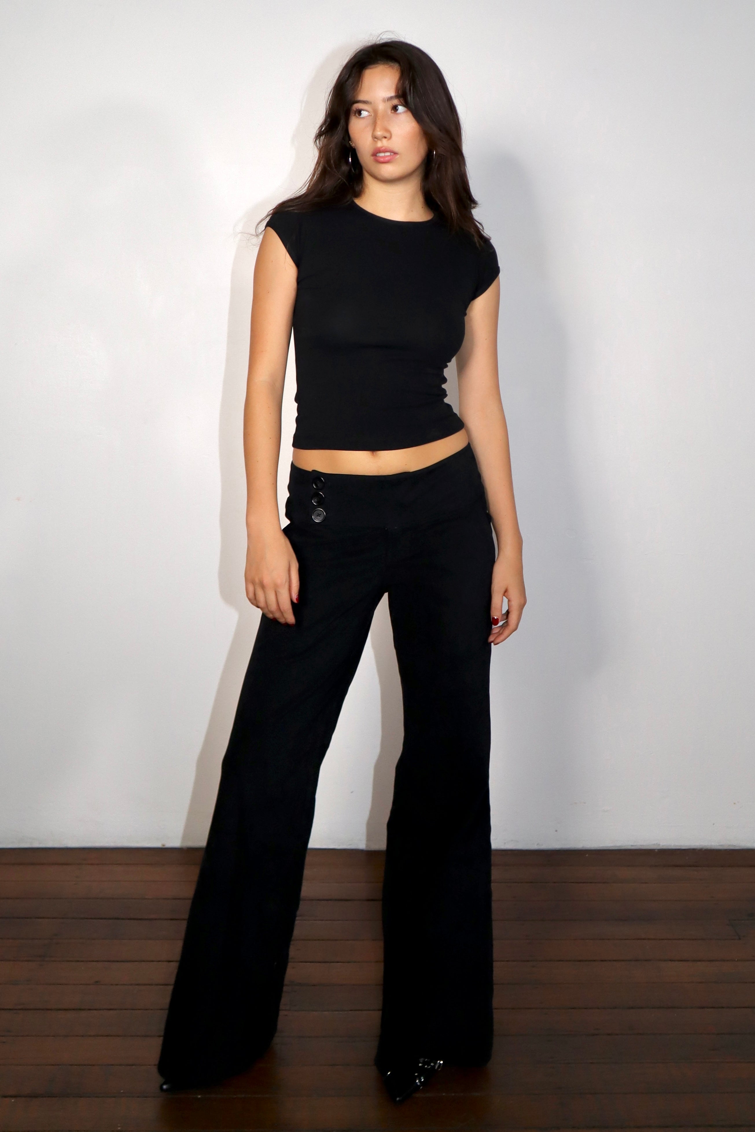 Early 2000s-inspired low-rise, wide-leg trousers feature a stylish waistband and buttons - blending comfort with chic style.