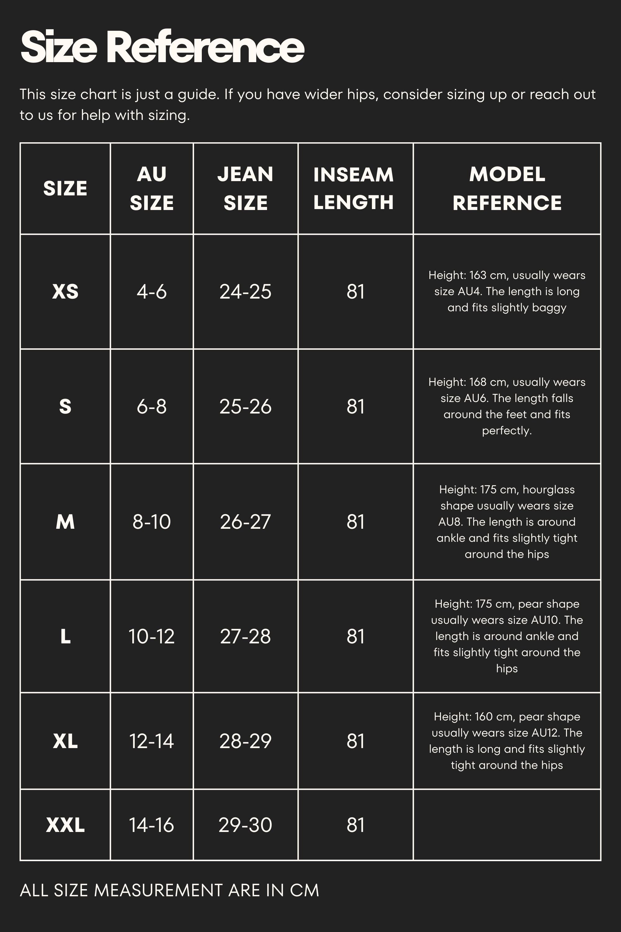 XS: Lower waist = 71 cm, hip= 84-92 cm, thigh = 74 cm, length = 100 cm, inseam length = 83 cm, fit size 23-25