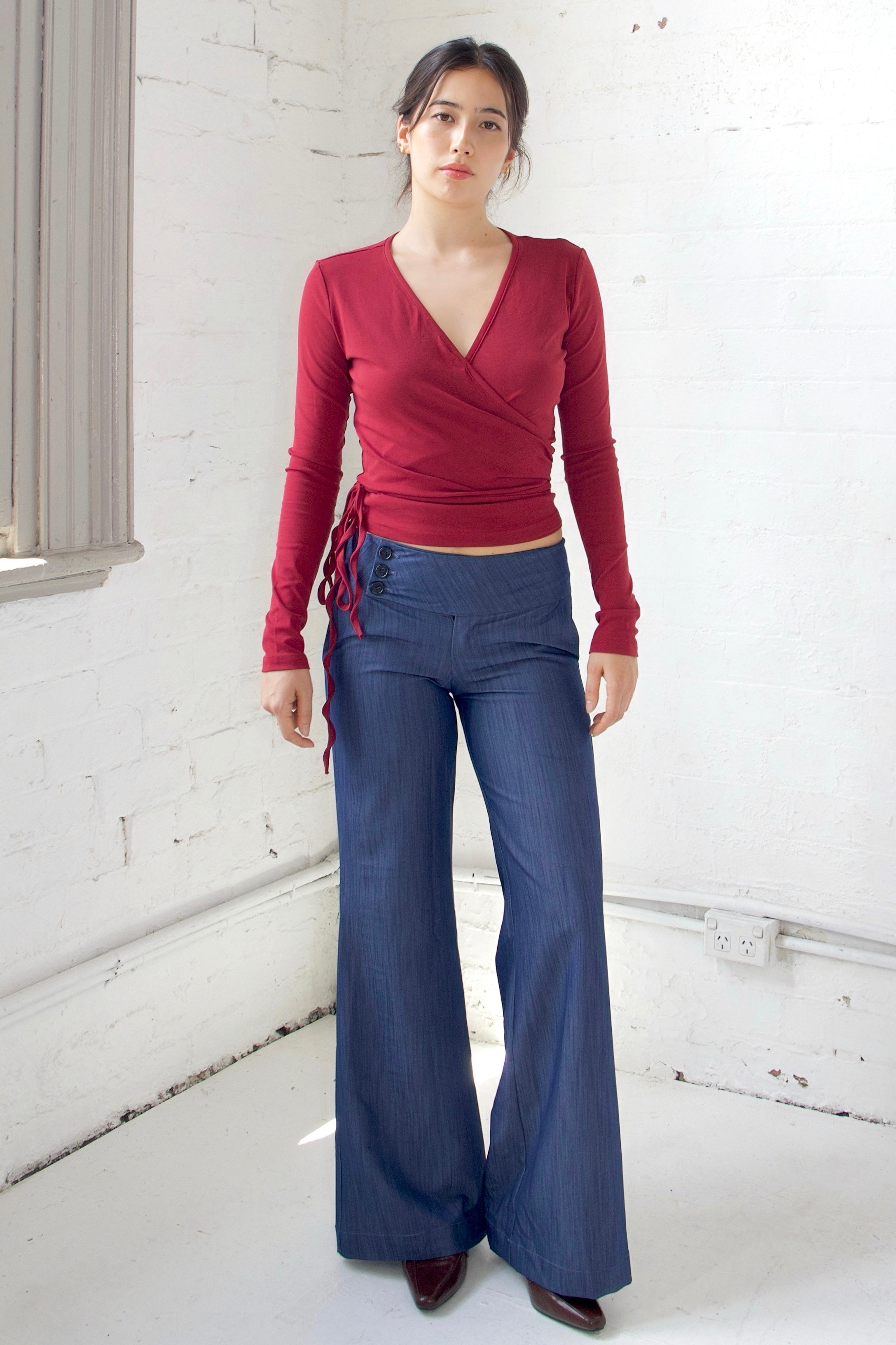 Introducing our 90s French-style long-sleeve wrap top, designed to elevate your everyday elegance