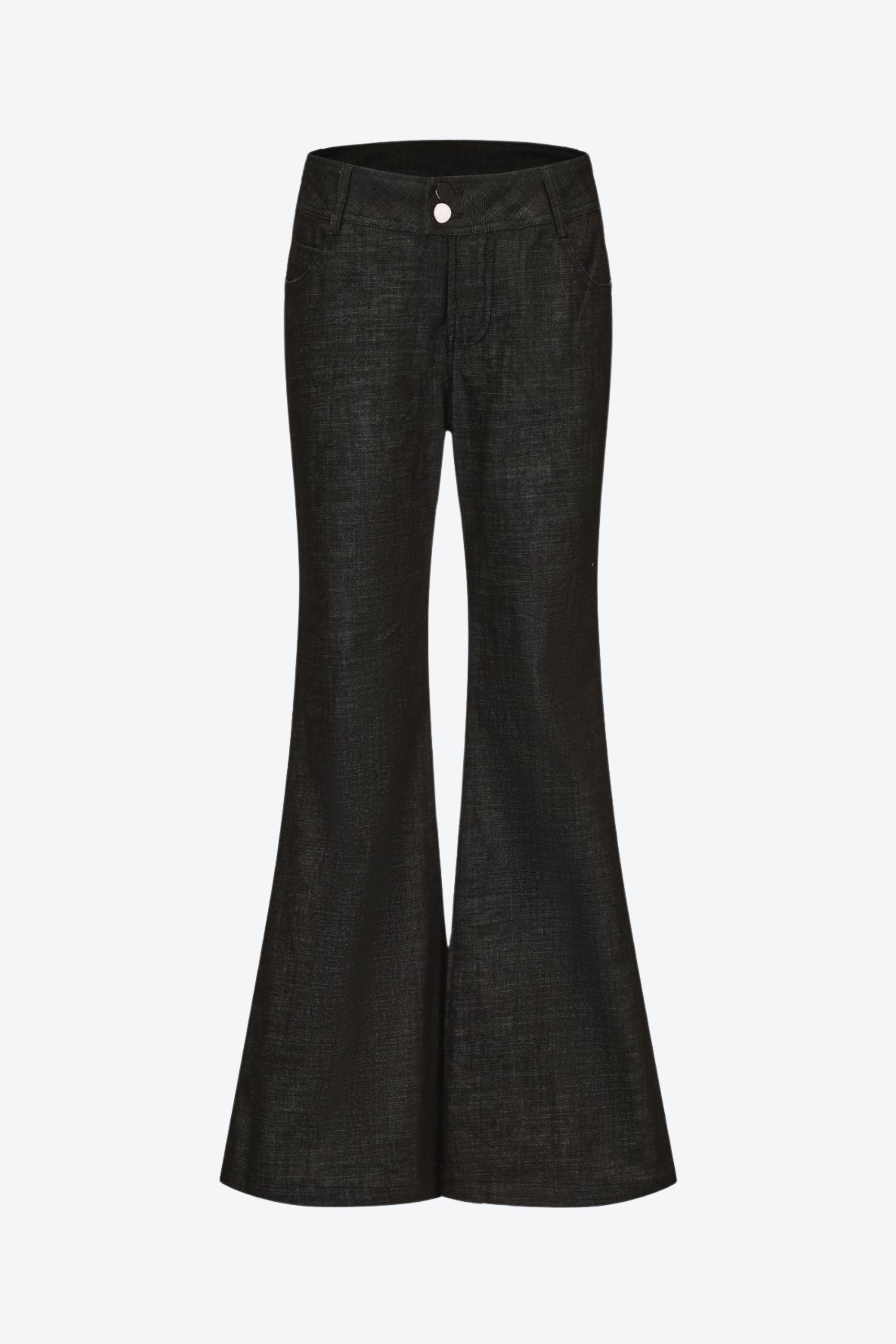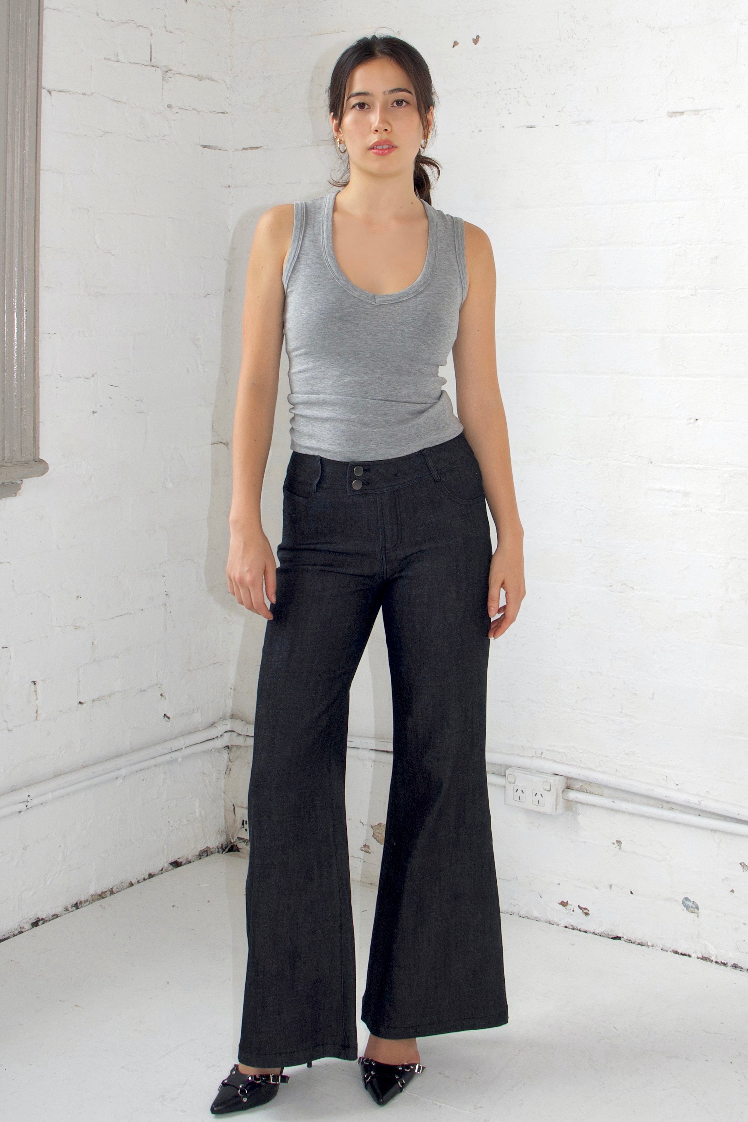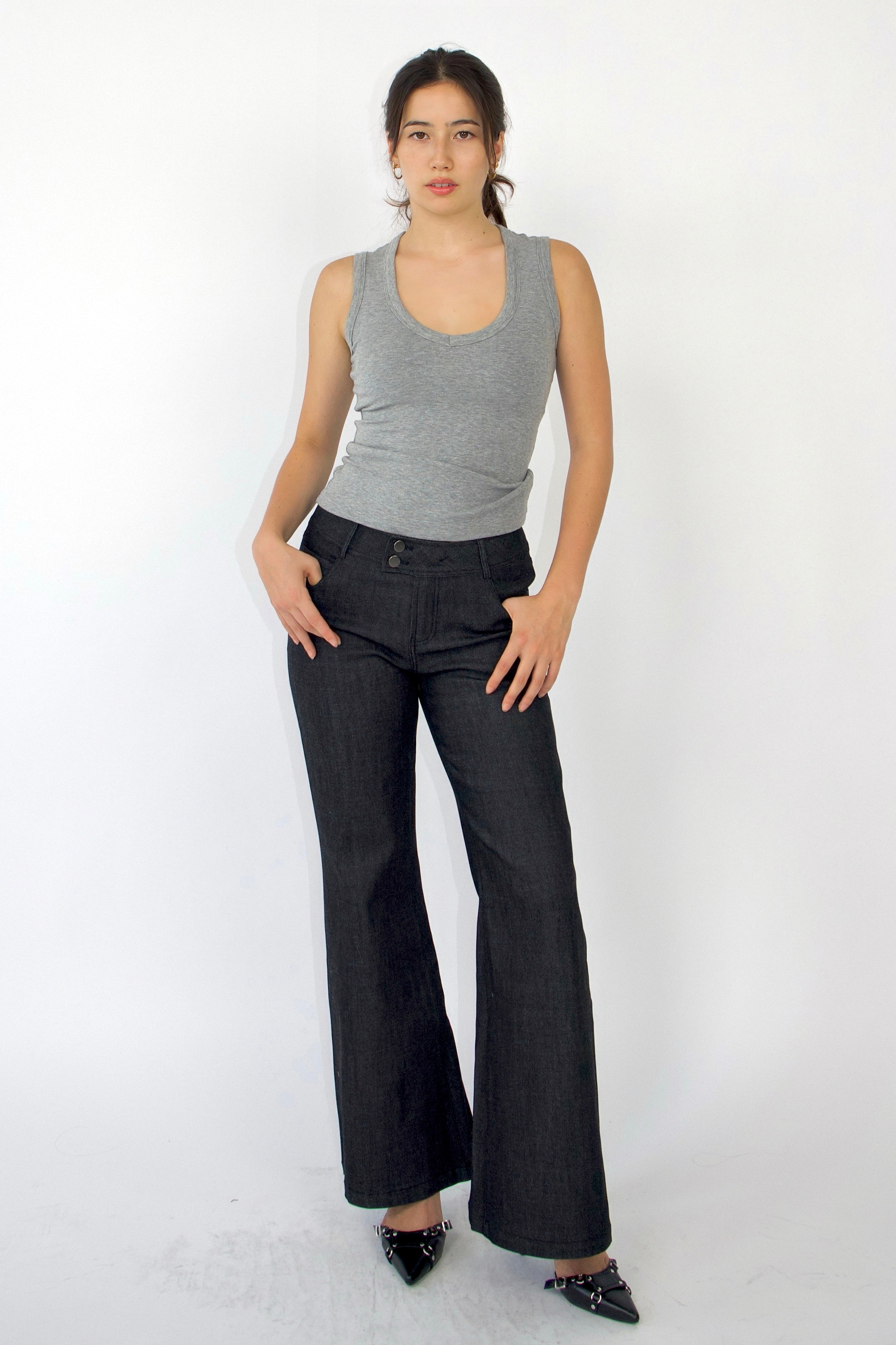 Low-rise, wide-leg stretch denim jeans inspired by early 2000s style. Minimal detailing and a double-button waistband add a subtle retro vibe. Stylish and versatile for any occasion