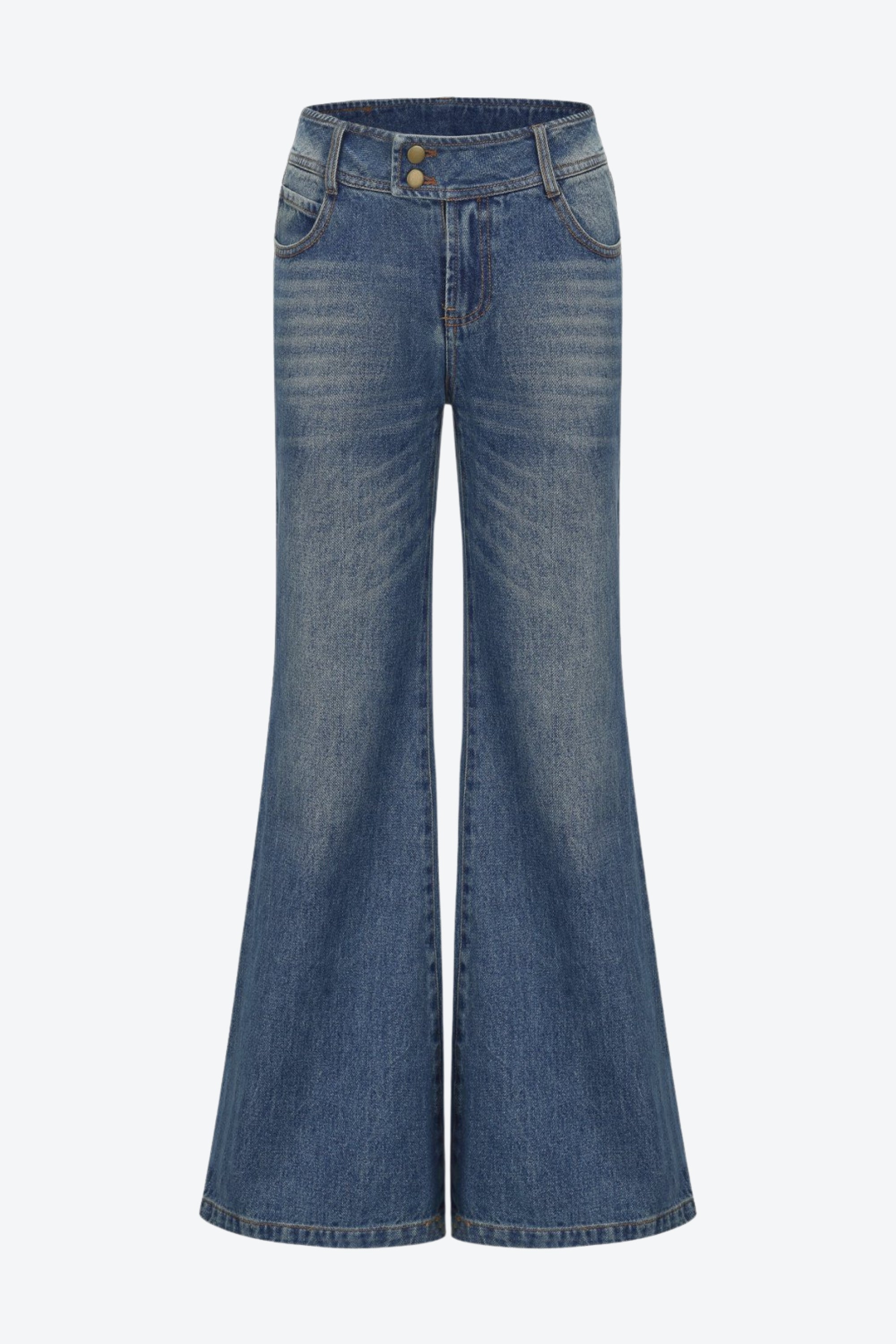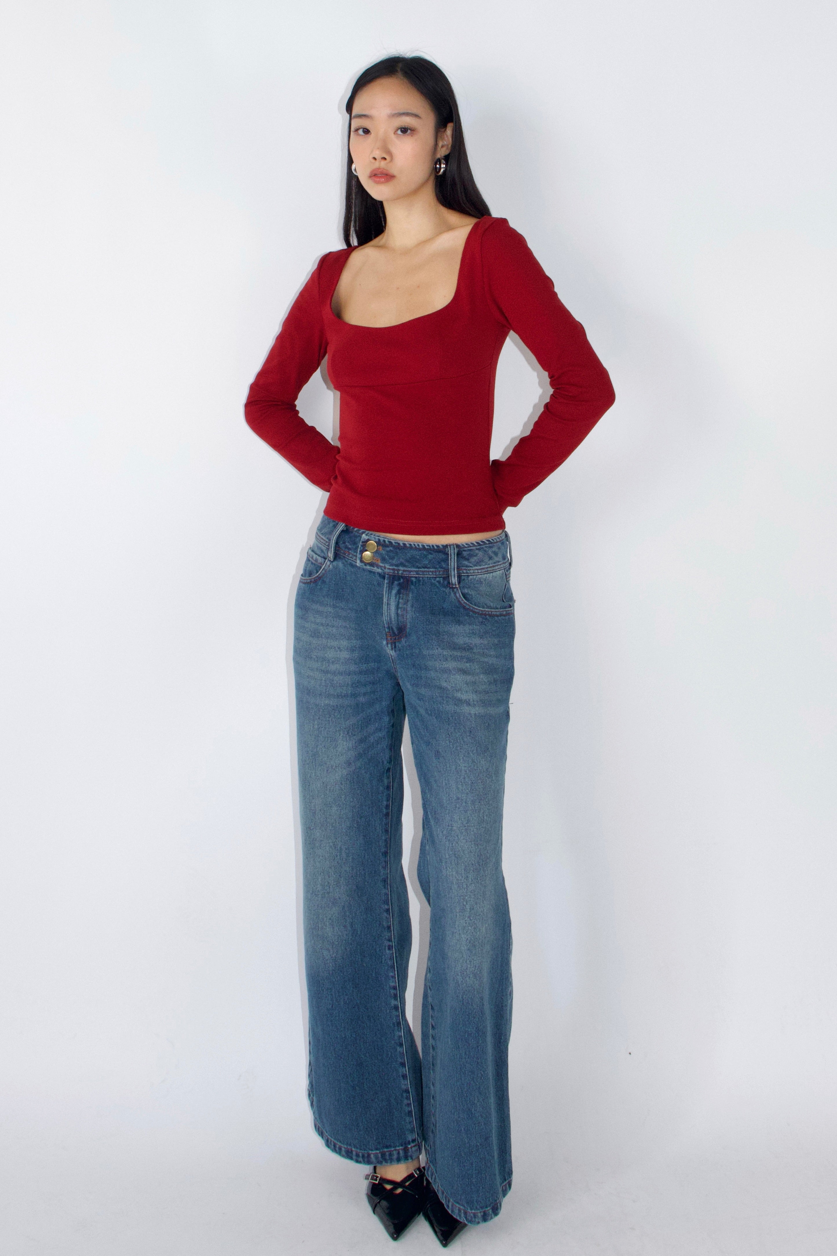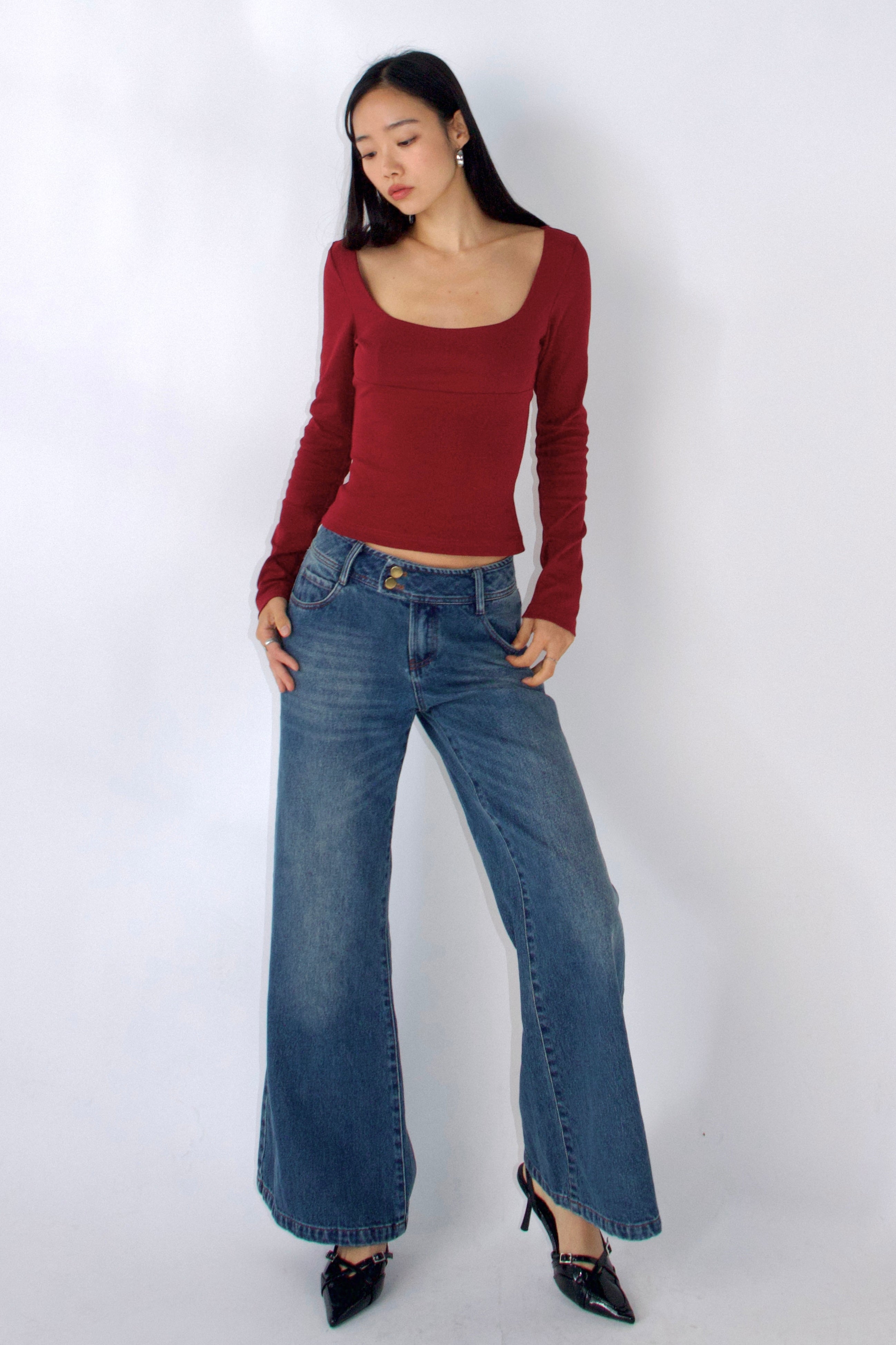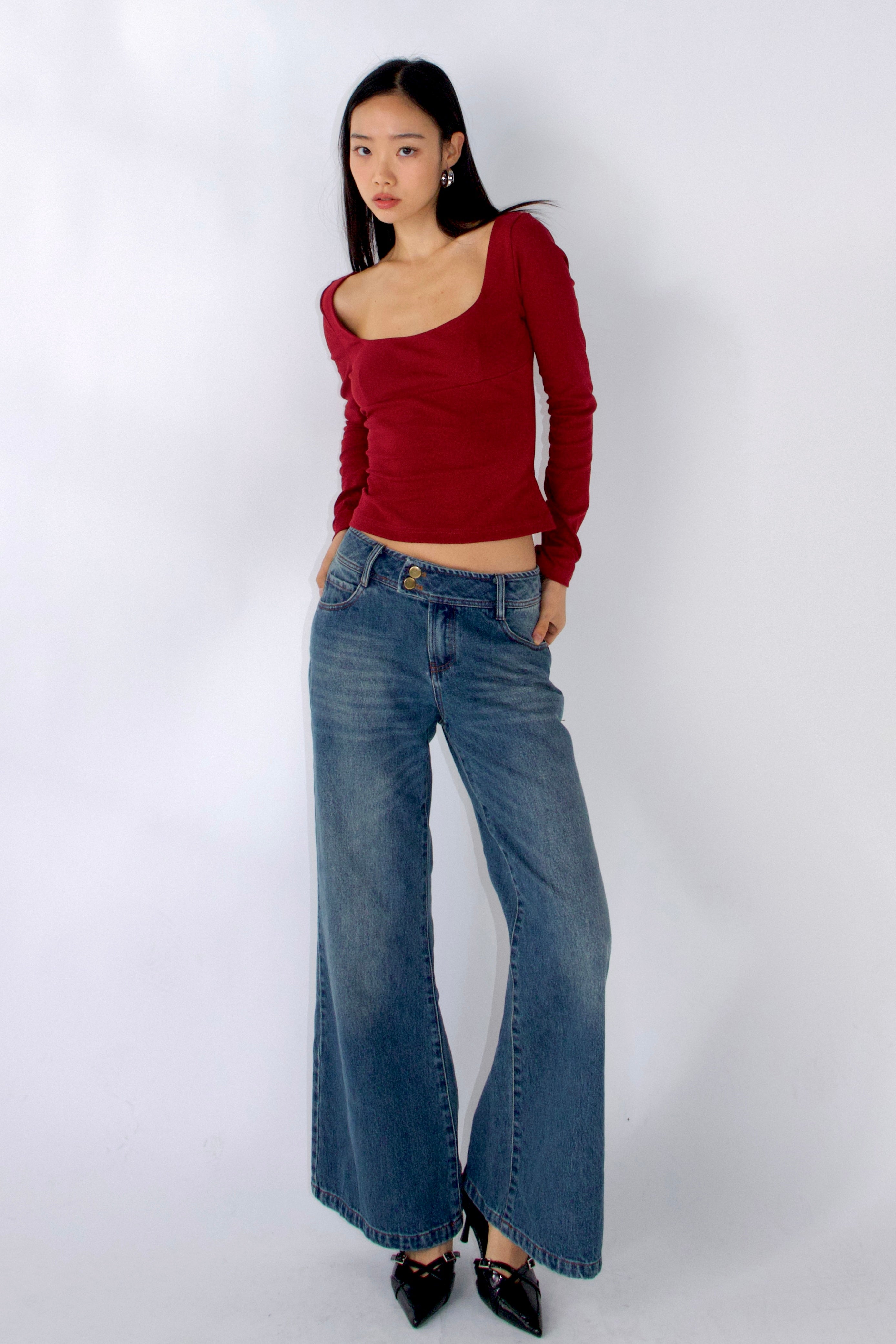 Low-rise, wide-leg stretch denim jeans inspired by early 2000s style. Minimal detailing and a double-button waistband add a subtle retro vibe. Stylish and versatile for any occasion
