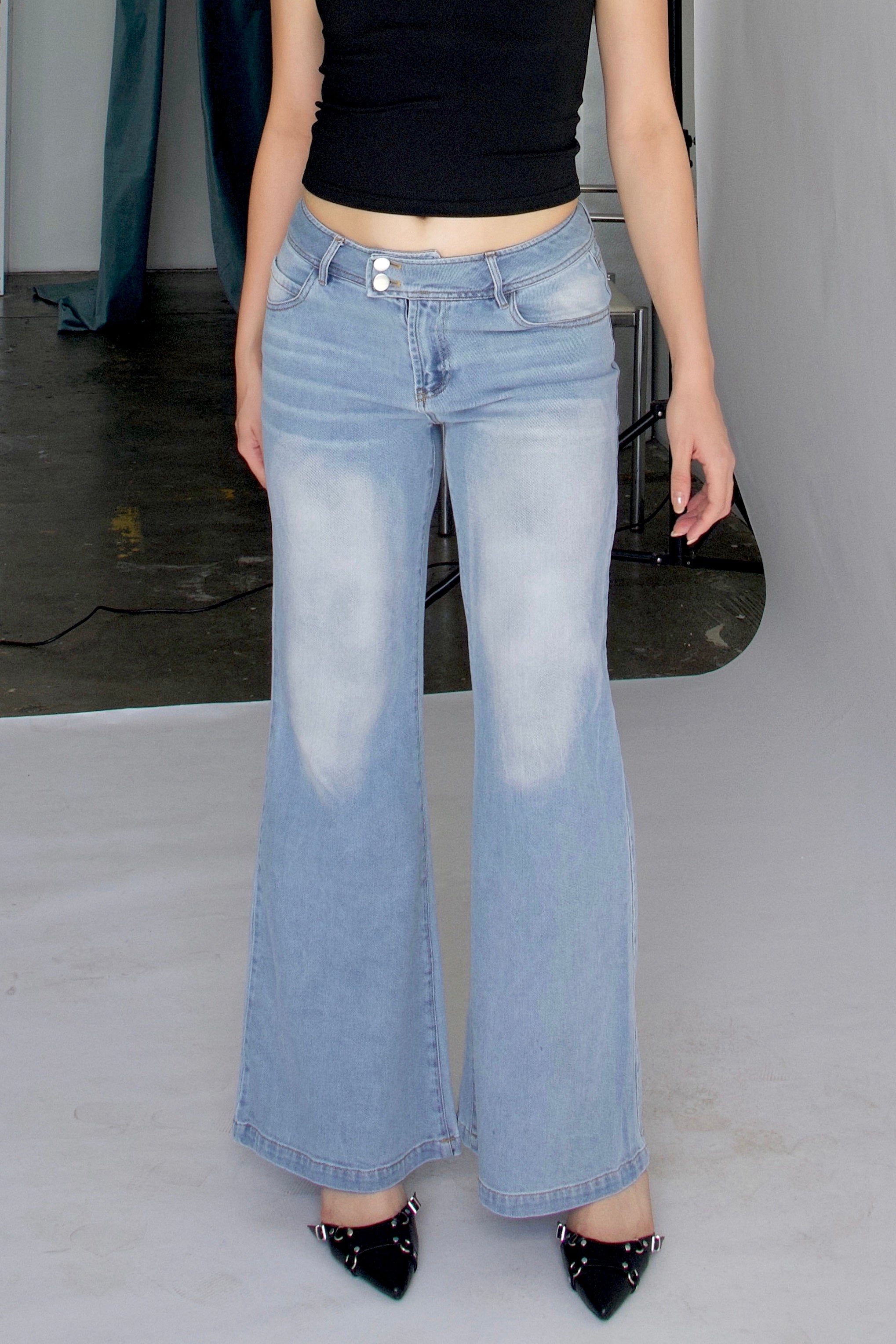 Low-rise, wide-leg stretch denim jeans inspired by early 2000s style. Minimal detailing and a double-button waistband add a subtle retro vibe. Stylish and versatile for any occasion