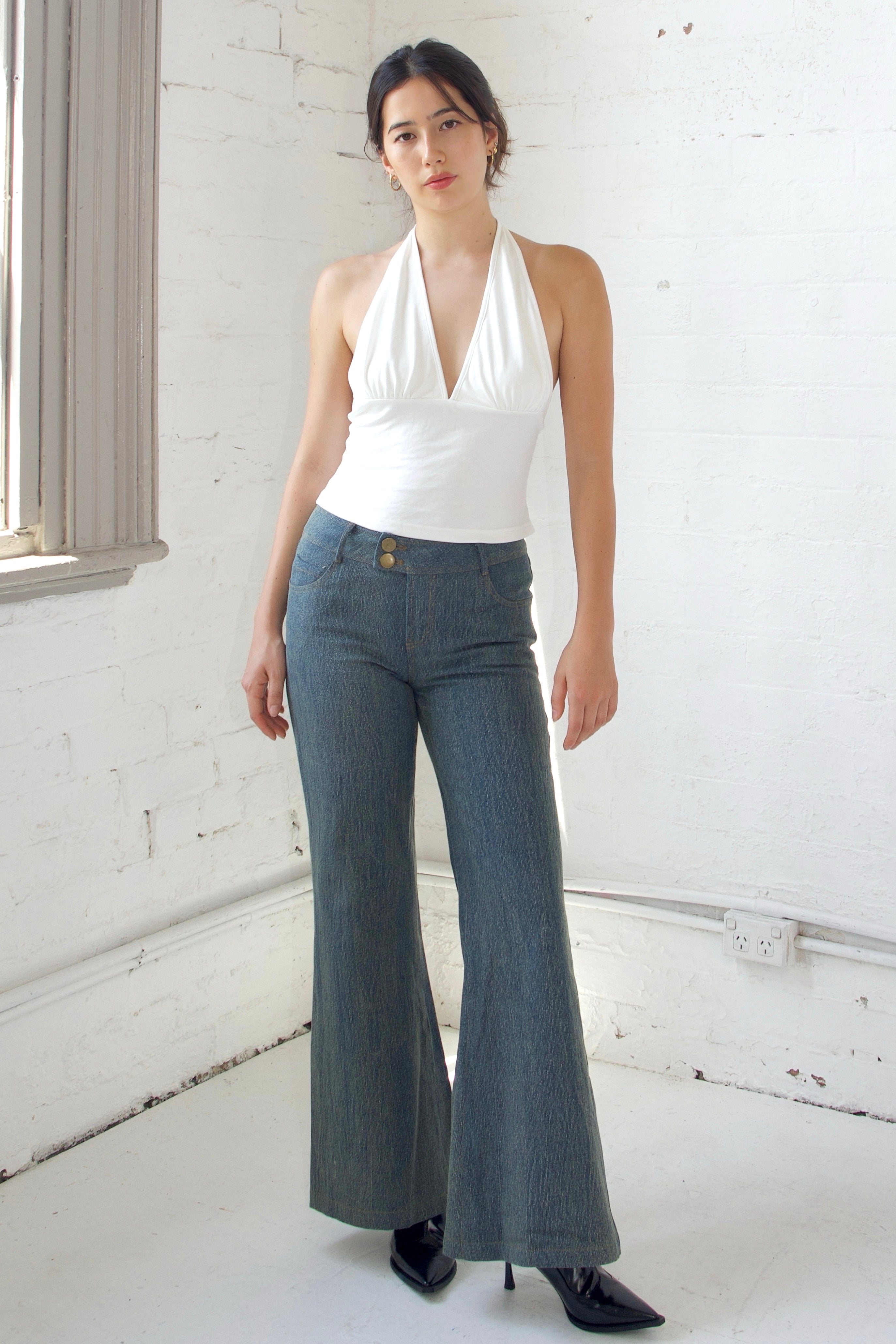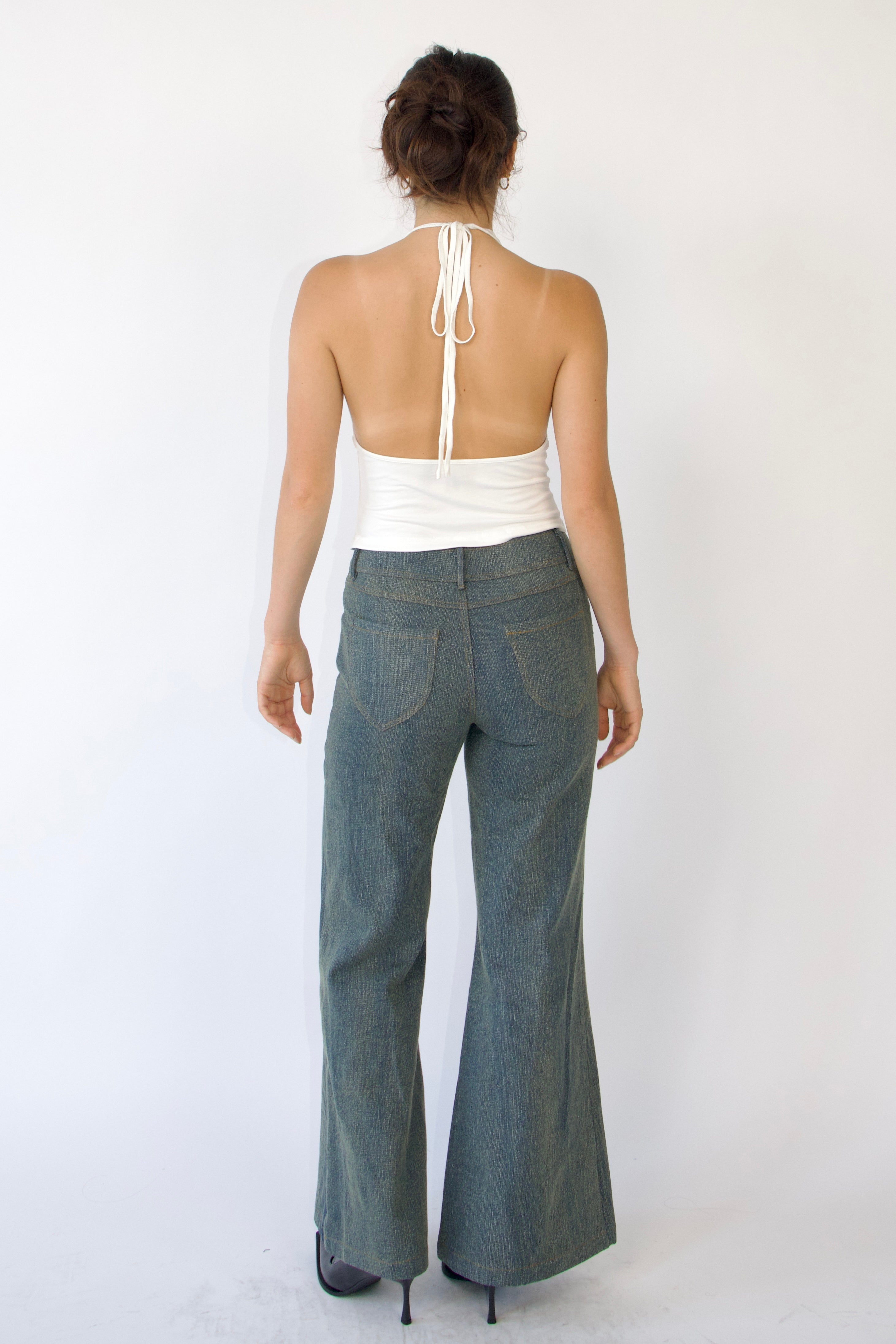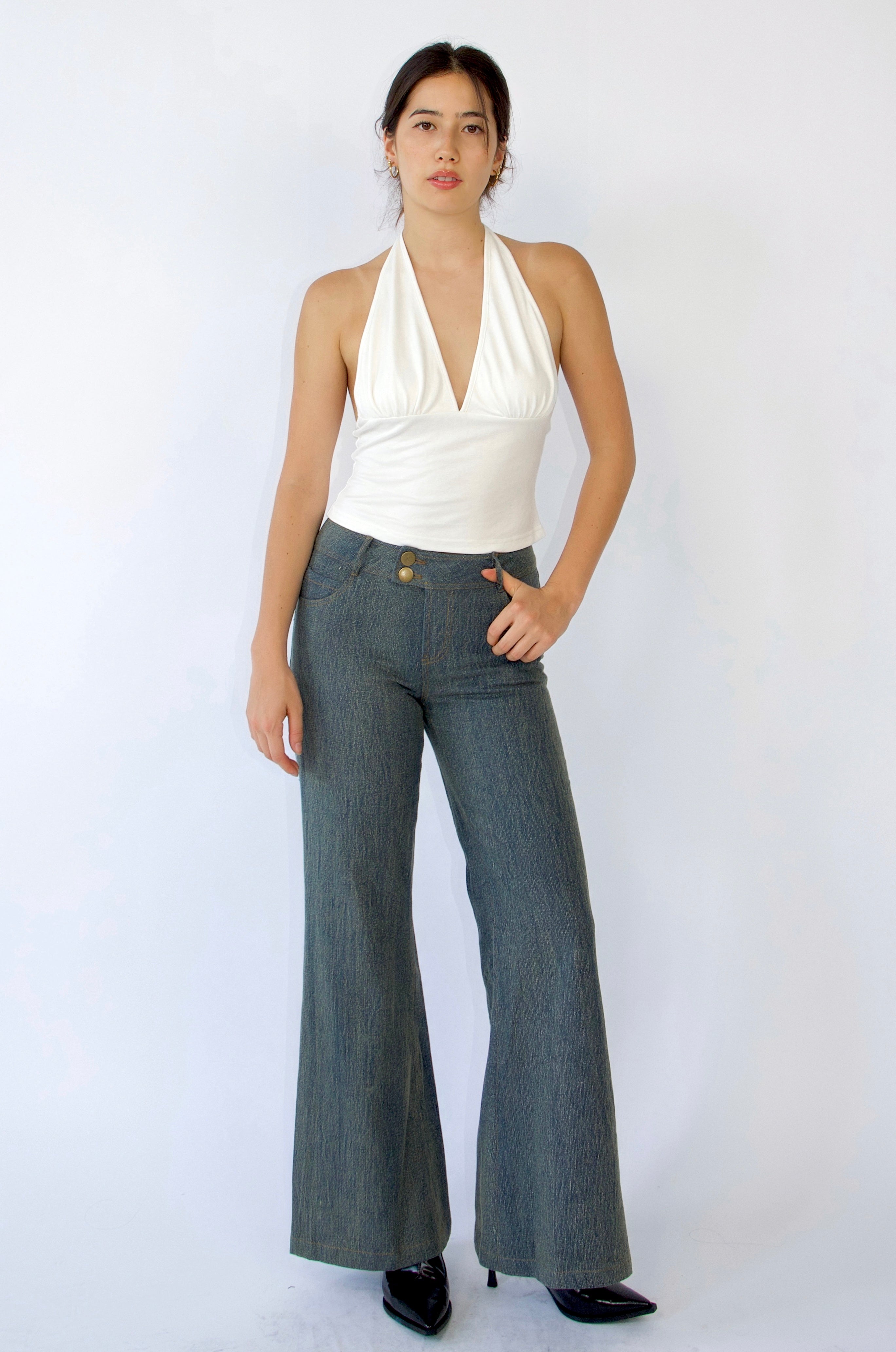 These jeans feature a low-waisted, wide-leg fit crafted from stretch denim, delivering a perfect blend of style and comfort. Inspired by early 2000s fashion, they showcase minimal detailing and a double-button waistband, adding a subtle retro vibe. Versatile enough for both casual and dressed-up occasions, these jeans effortlessly bring a nostalgic yet modern edge to any outfit.