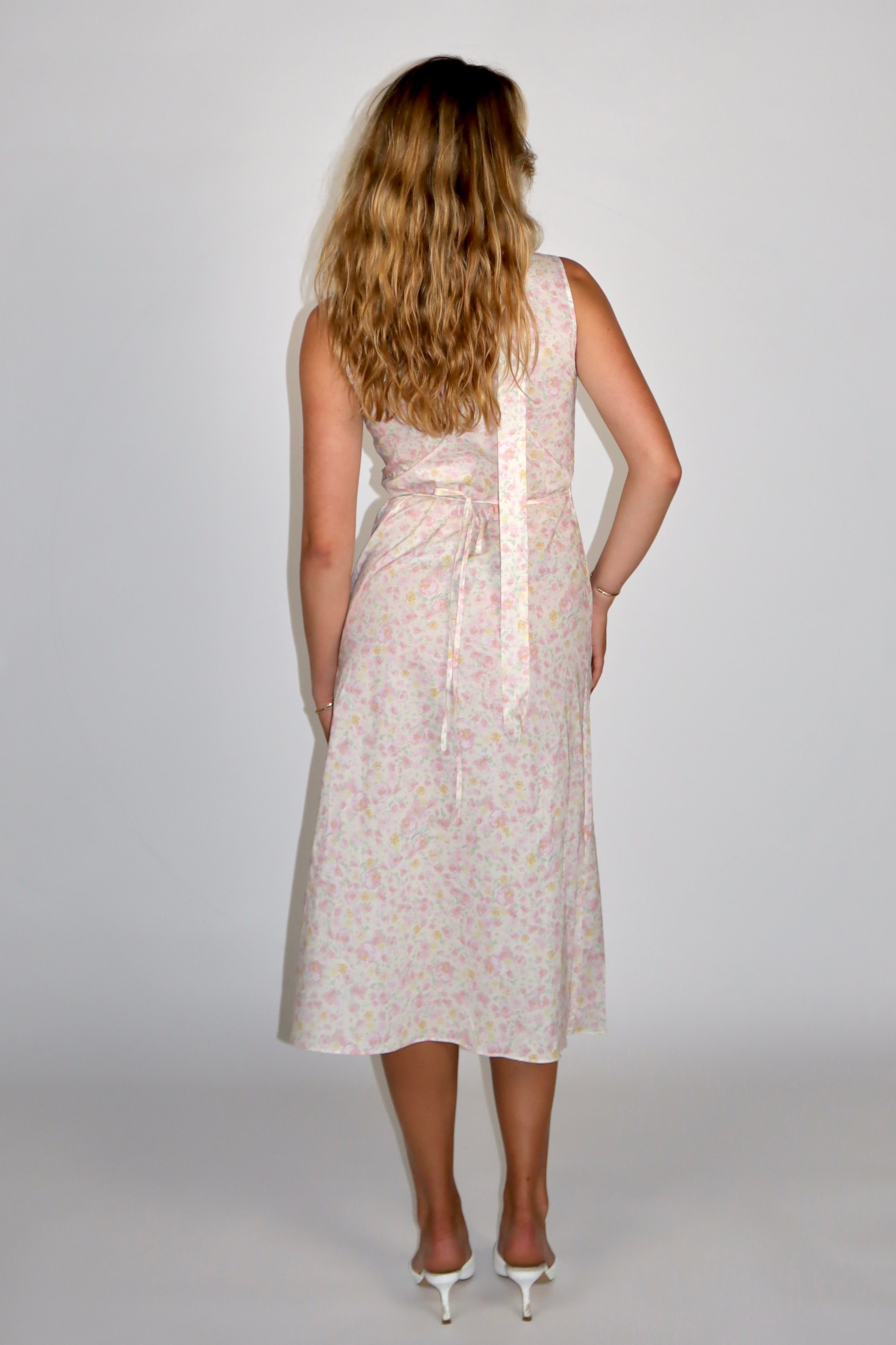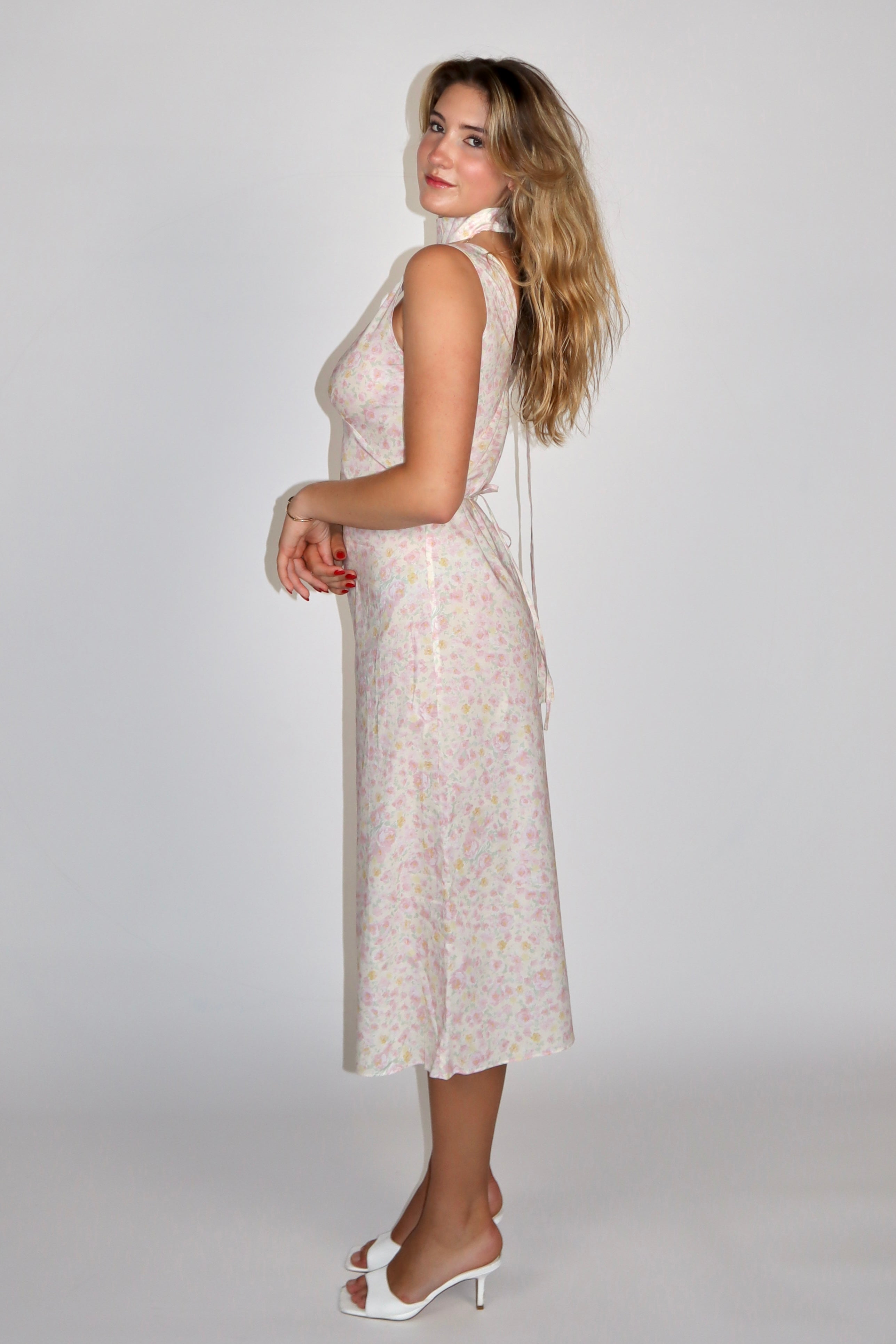 This v-neck midi dress features pink floral detail, inspired by the pink rose garden. The unique part of this dress is the matching thin scarf that comes with the dress, which adds some elegance to your look.