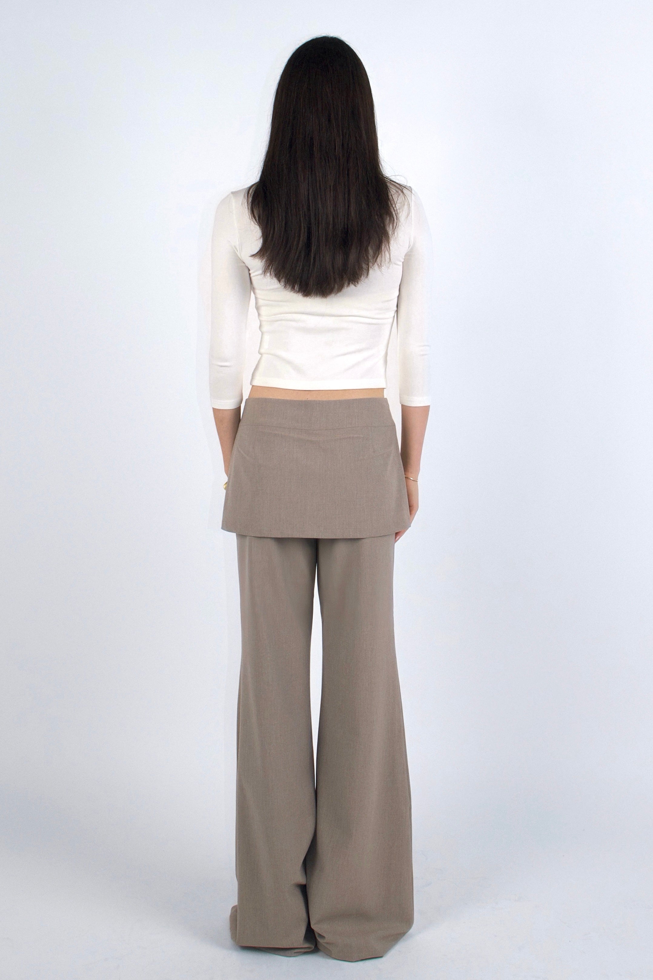 The Tierra Pants reinterpret tailoring through balance and texture. Designed with a low-rise waist and a softly draped skirt overlay, they blur the line between structure and movement. The layered panel folds gently across the body, creating a quiet play of form, architectural yet fluid.