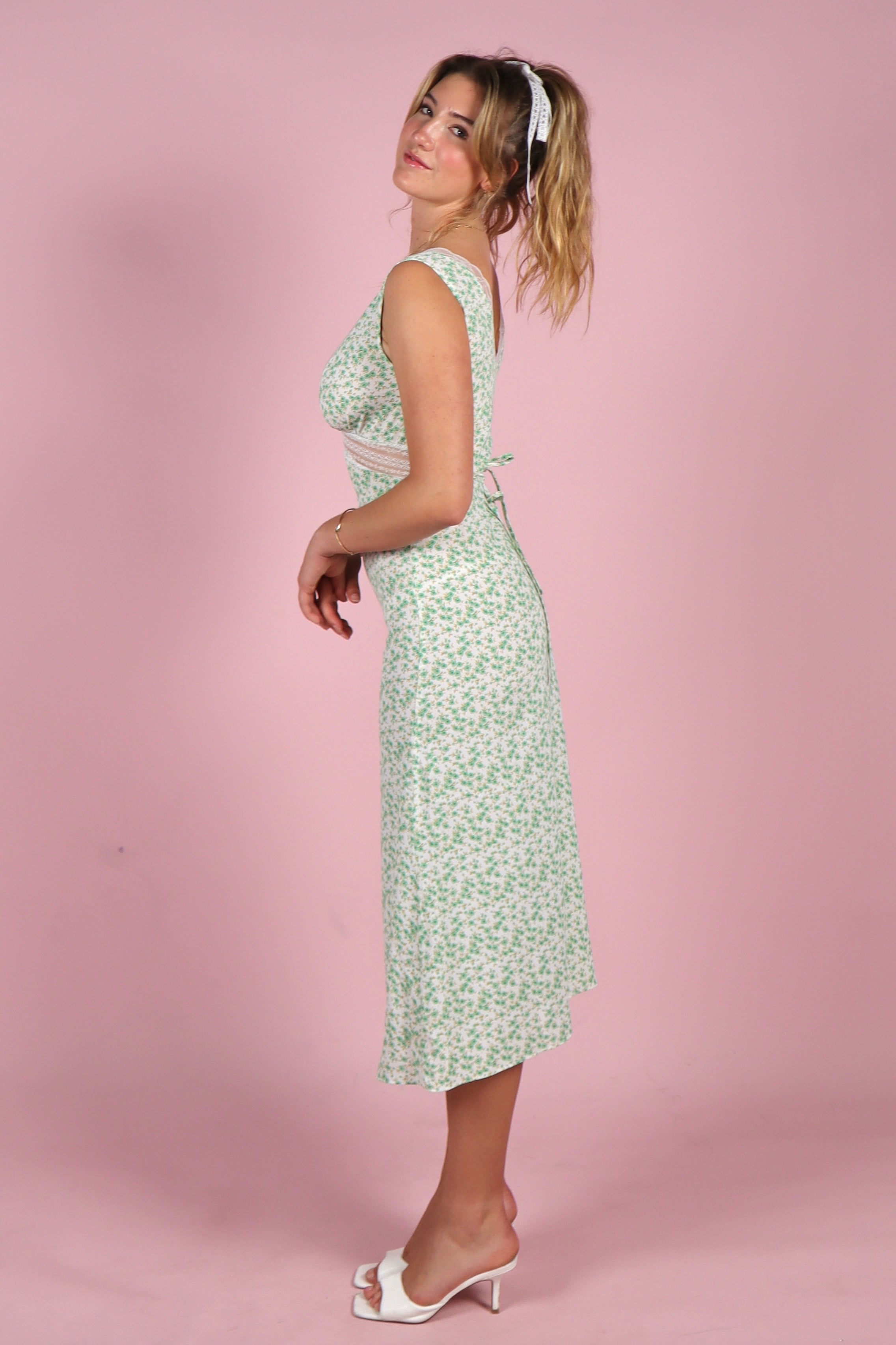 Introducing our romantic v-neck midi dress with green floral and lacey details around the neck and bust area - the ultimate summer dress that effortlessly exudes style! This dress draws inspiration from the doll dress, bringing a nostalgic 90s vibe that will captivate anyone.