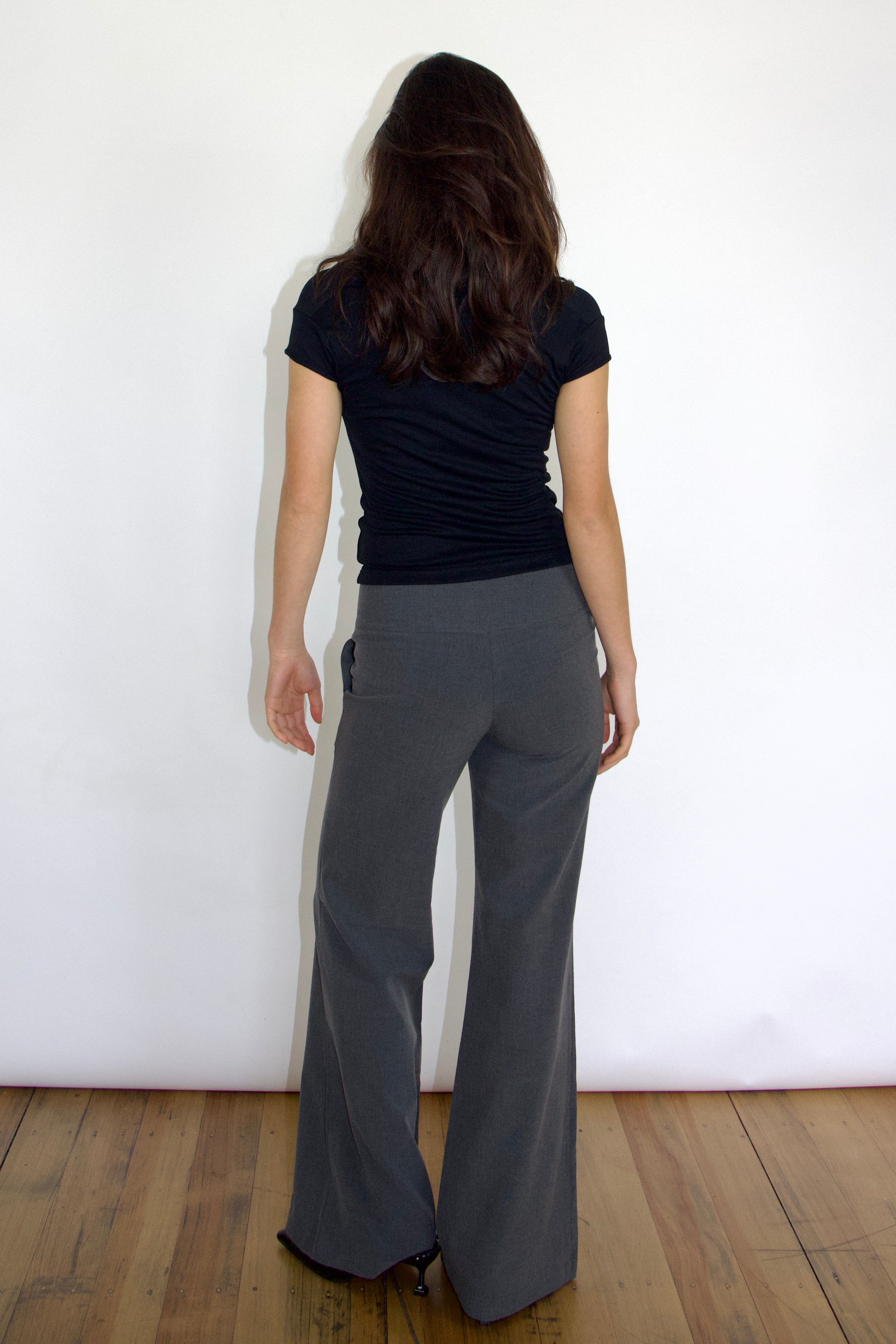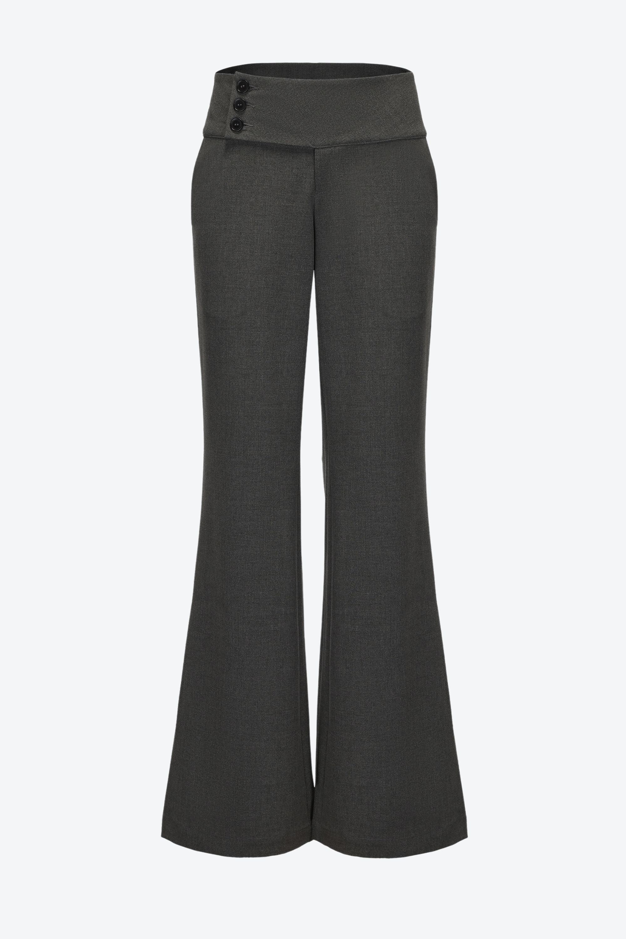 21 世纪初风格的低腰阔腿裤配有时尚的腰带和纽扣,将舒适与别致风格融为一体。